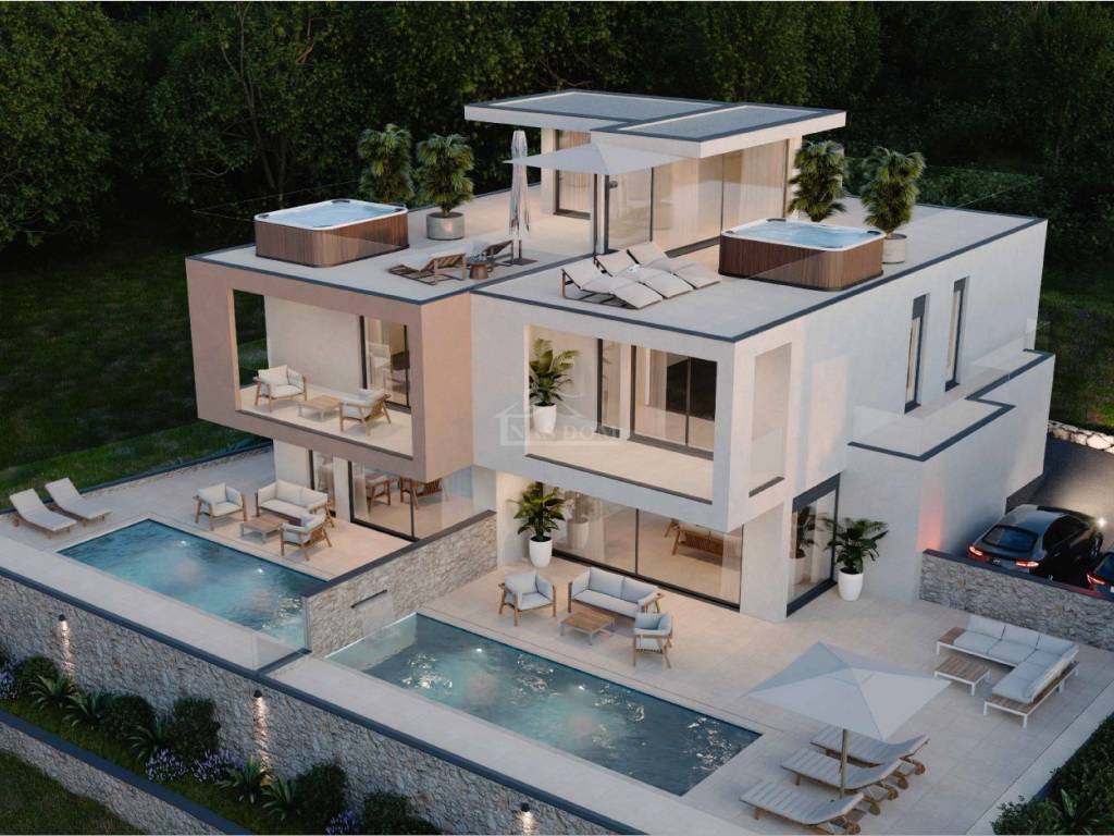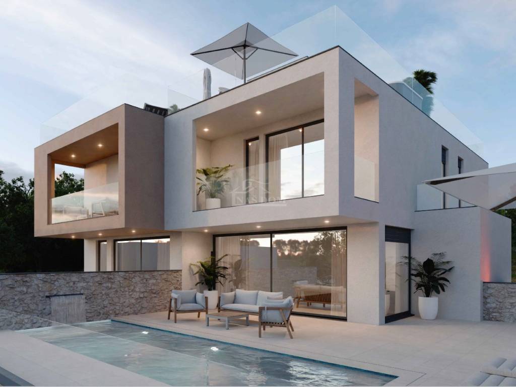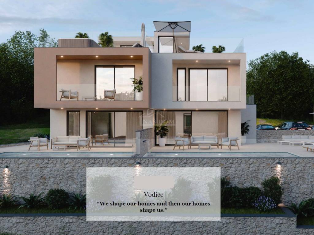 Vodice-**NEW BUILDING** a luxurious semi-detached house is for sale . The building will be constructed using quality materials and will be equipped according to the latest construction standards. Notable features include: polystyrene facade, PVC joinery, electric roller shutters, lift-slide walls, ceramic floor coverings in the bathrooms, kitchen, and living room, laminates in the bedrooms, modern bathroom fixtures, electric water heater, INVERTER air conditioning for heating/cooling in the bedrooms and living room, underfloor heating with a heat pump, video surveillance...