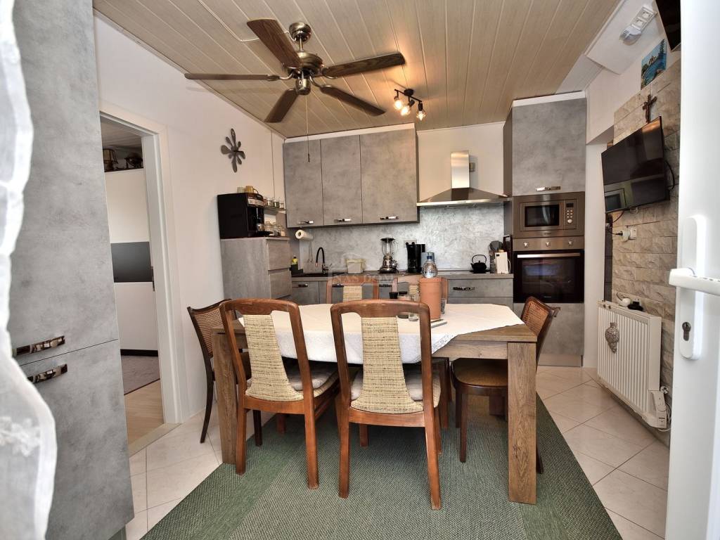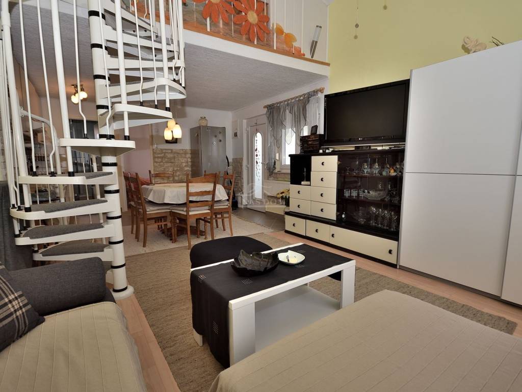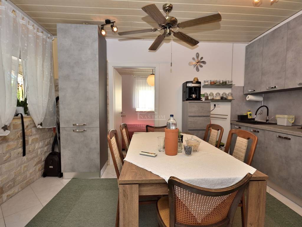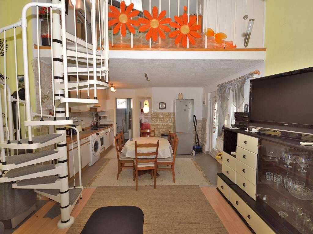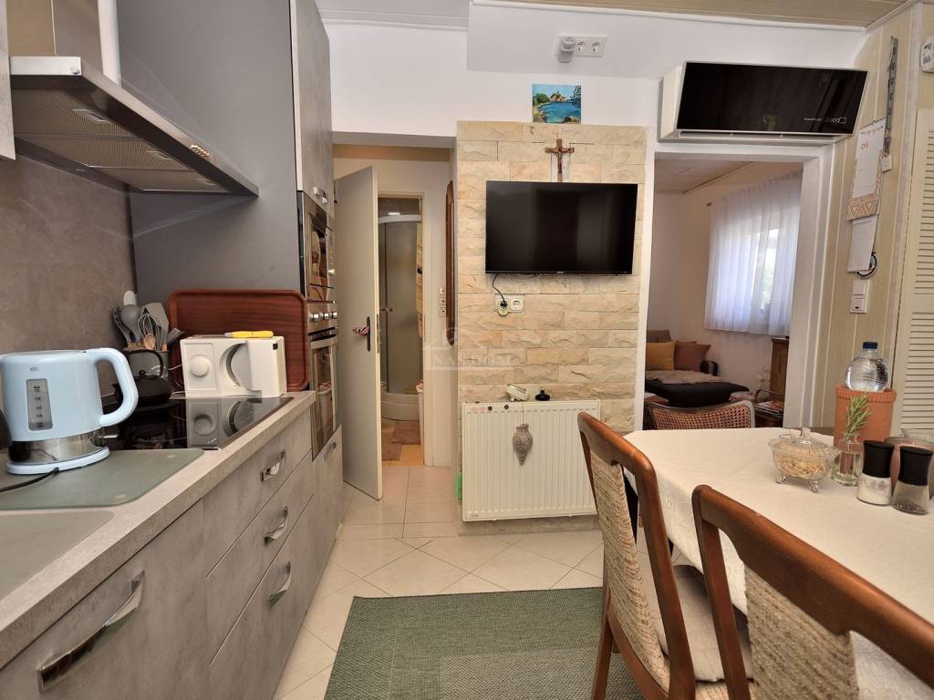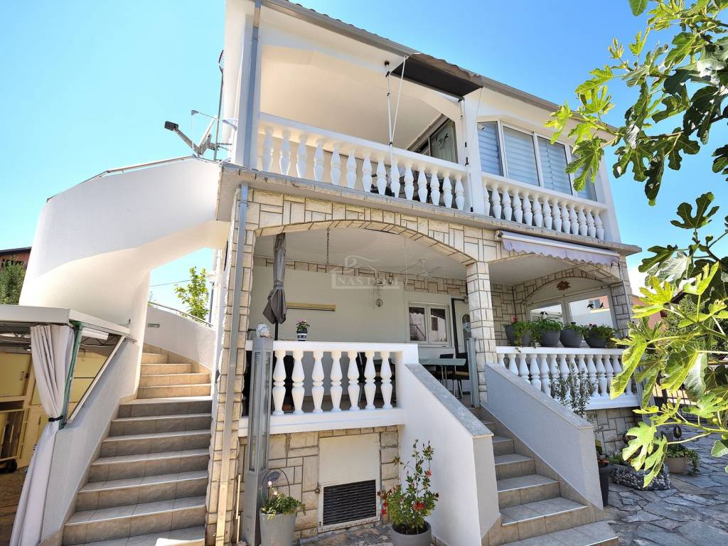 Tribunj - furnished house for sale with a total of two apartments in a quiet location. The house is situated on a plot with a total size of 227m2, a floor area of 81m2, and consists of two floors: raised ground floor and first floor with a gallery. On the ground floor, there is one apartment consisting of a spacious loggia, kitchen with dining area, living room, bathroom, and one bedroom. External stairs lead to the first floor of the house where the second apartment is located, consisting of a terrace, loggia, bedroom, bathroom, kitchen with dining area, and living room. Internal spiral stairs lead to the gallery above the kitchen and dining area, used as an additional bedroom. The house yard is landscaped, paved with natural stone, and includes a seating area, summer kitchen and barbecue, and a small garden cultivated with Mediterranean herbs. The house is air-conditioned and furnished, has a storage room and two parking spaces. It is located in a quiet area, at the end of a dead-end street, close to all amenities essential for a comfortable stay and/or living; it is about 600m from the beach and 900m from the center.