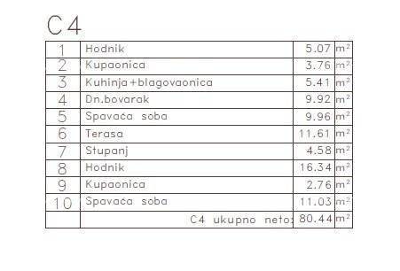 Apartment in a new modern building in Medulin, under construction.APARTMENT - C4 is on two levels and is located on the 2nd and 3rd floors of the building. The apartment consists of:a hallway, 2 bathrooms, a kitchen + dining area, a living room, 2 bedrooms, and a terrace. Total net area: 80.44 m².Sea air and climate: Mediterranean climate with warm summers and mild winters – ideal for permanent residence or vacation.Excellent location:Medulin is one of the most popular towns in southern Istria,only 300 m from the sea!!!The center of Medulin is just a few minutes" drive away,nearby there is a promenade, restaurants, shops, and an asphalt road.For more information, please contact:Azra Valjevac +385 91 611 5706 +385 98 420 885 azra@almadominvest.com