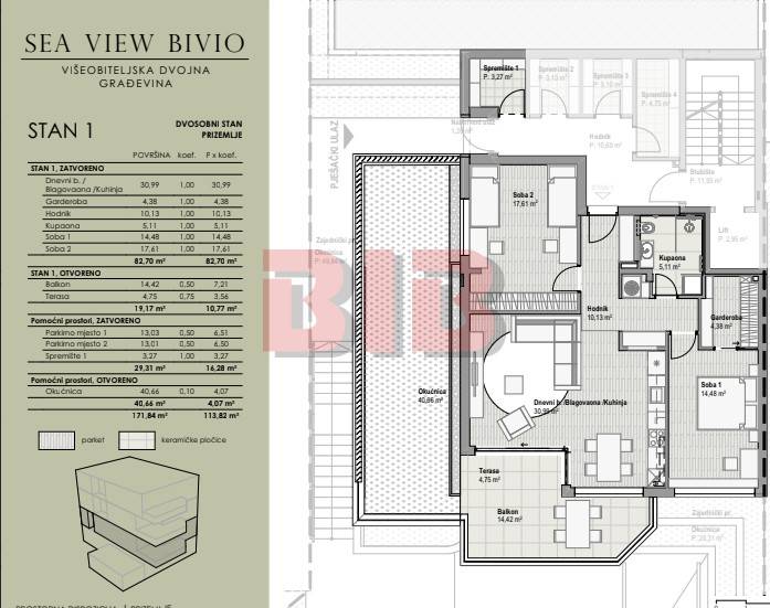 Stan se sastoji od hodnika,dnevnog boravka sa kuhinjom i blagovaonicom,2 spavaće sobe,kupaonice,garderobe,balkona,terase, 2 garažna mjesta,vrta -okućnice 40,66m2 i spremišta.