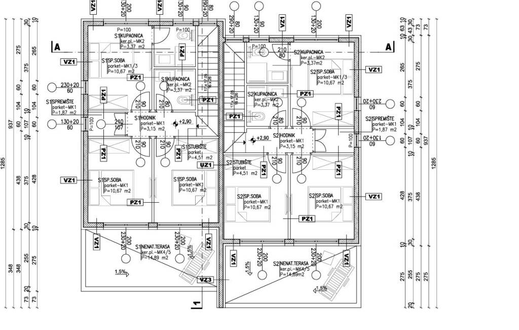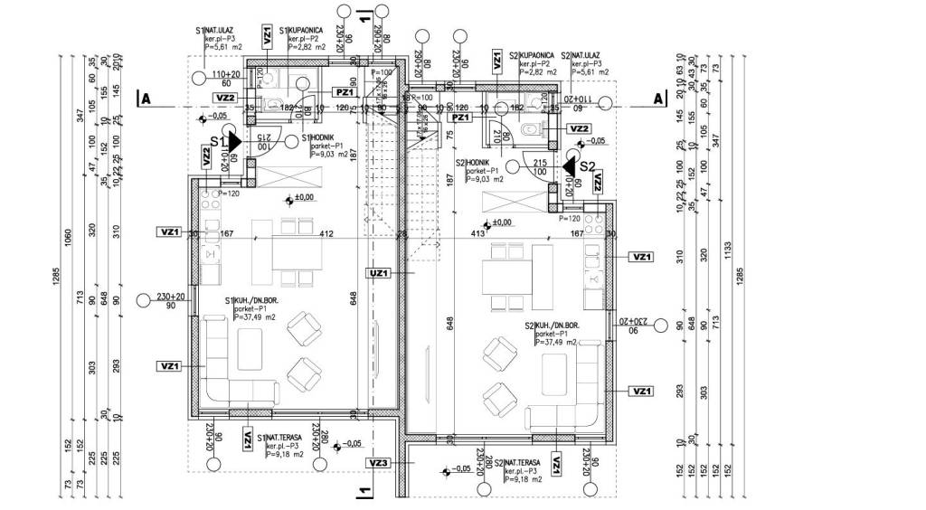 - Ground floor: An open living space that includes a kitchen, dining area, and living room with access to the terrace and landscaped garden. This floor also features a guest toilet. - First floor: Three bedrooms, two modern bathrooms, and a storage room. One of the bedrooms has its own bathroom, while two rooms have access to a covered terrace with a pergola, perfect for relaxation.