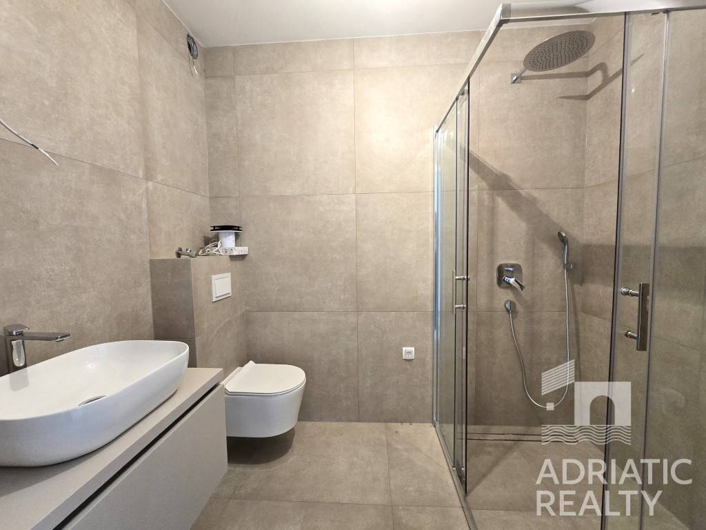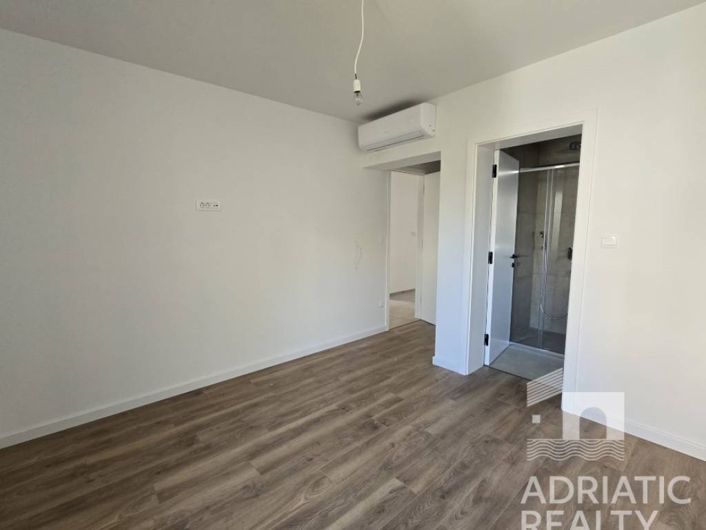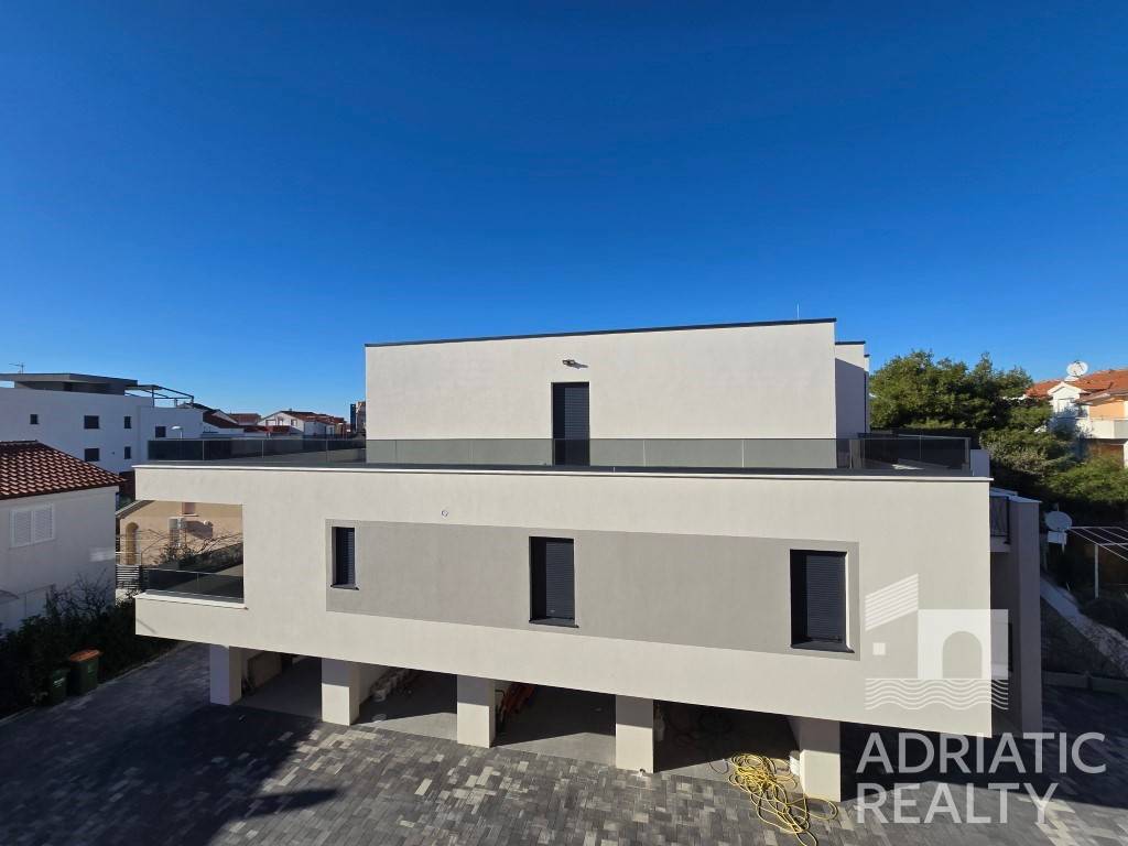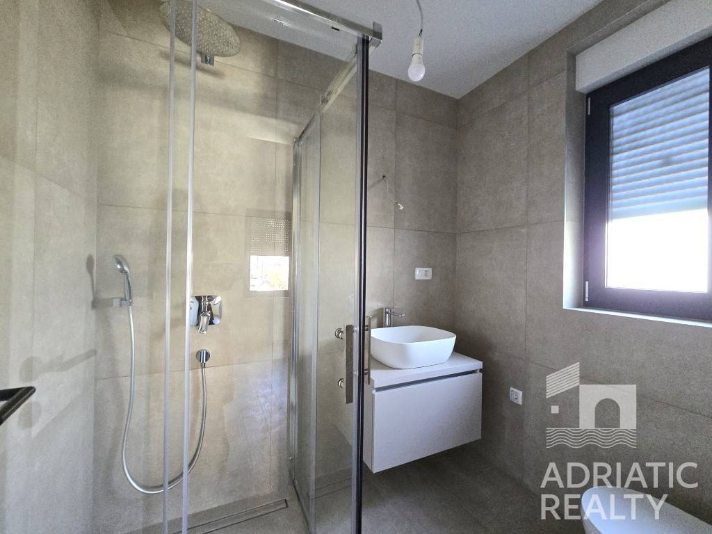 Na prodaju je prostran i moderan apartman S3 smješten na prvom katu suvremene zgrade s četiri stambene jedinice i garažama u Srimi. Neto korisna površina apartmana iznosi 113,09 m2, dok stambeni dio zauzima 104,88 m2. Apartman se sastoji od kuhinje, blagovaonice i dnevnog boravka otvorenog koncepta, tri spavaće sobe, od kojih dvije imaju vlastitu kupaonicu, dodatne kupaonice, predprostora i natkrivene terase. Opremljen je kvalitetnom keramikom, modernom sanitarijom, prozorima i vratima s električnim roletama i komarnicima te protuprovalnim ulaznim vratima. Za dodatnu udobnost, kupaonice imaju električno podno grijanje, dok su sve sobe i dnevni boravak klimatizirani te opremljeni TV priključcima. Apartmanu pripada i garaža, što pruža dodatnu praktičnost i sigurnost.