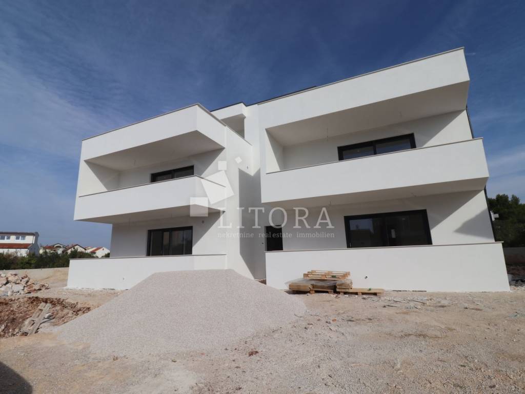 Vodice – Newly Built Apartment with Yard in a Quiet Location. Modernly apartment of 56.80 m², located on the ground floor of a small residential building in a quiet area of Vodice. The apartment consists of a hallway, bathroom, two bedrooms, and an open-plan space combining the kitchen, dining room, and living room, with access to a covered terrace of 13.39 m² and an adjoining fenced yard of 84.00 m² – ideal for relaxation, children’s play, or additional amenities such as a barbecue or garden shed. The apartment is equipped with air conditioning in the living room, while the installations for additional units have already been made in the bedrooms, underfloo heatig in the bathroom and living room with kitchen. It includes one outdoor parking space, with the possibility to create additional parking thanks to its direct connection to the yard.