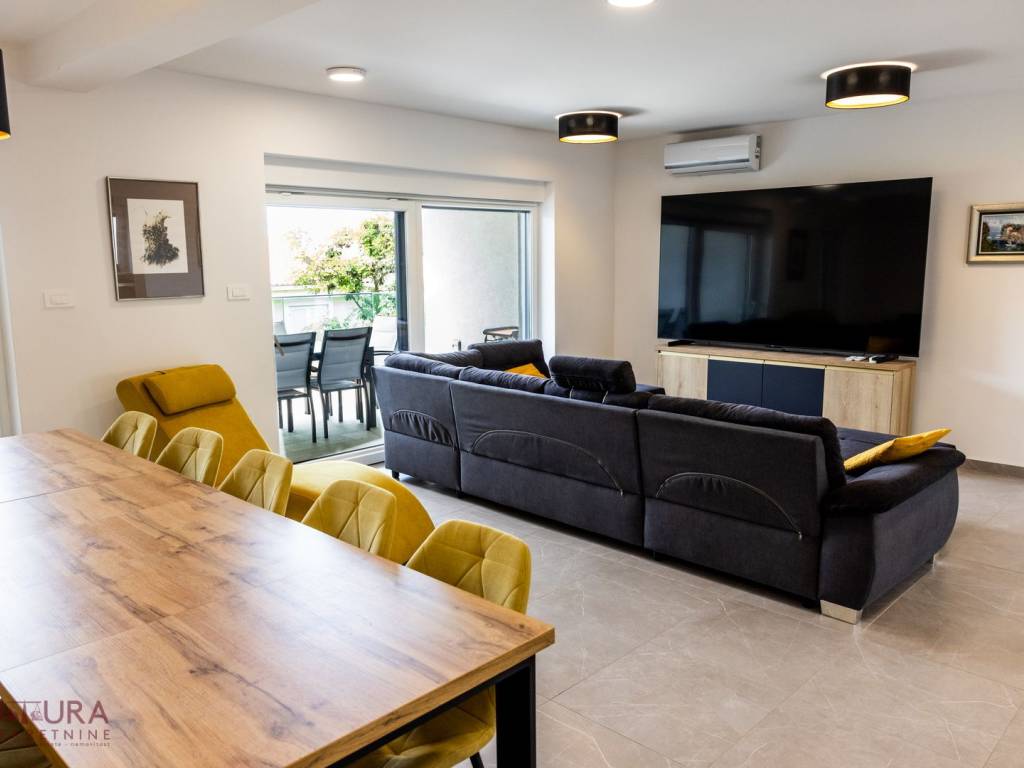 Pag - Mandre, a three-bedroom apartment of 146.71 m2 is for sale on the first floor of a residential building with a total of six apartments, built in 2000 and completely renovated in 2023, fully furnished.