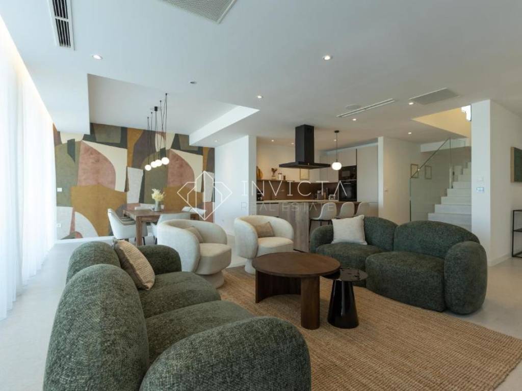 The spacious interior includes four elegant bedrooms, designed for maximum comfort and privacy. Thanks to its west and northwest orientation, the villa is bathed in natural light throughout the day, while its windows offer an unmatched panoramic sea view.