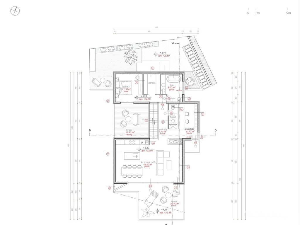 GROUND FLOOR - engine room for the swimming pool, storage room, garden, 2 bedrooms, bathroom, toilet, hallway, kitchen + dining room + living room, terrace, swimming pool