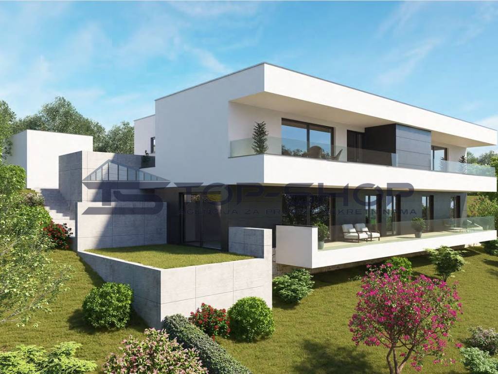 Gračani, luxurious five-room apartment on the ground floor of a small urban villa with a large covered terrace, garage, and 2-5 outdoor parking spaces, as well as a spacious private garden totaling 250 m2.