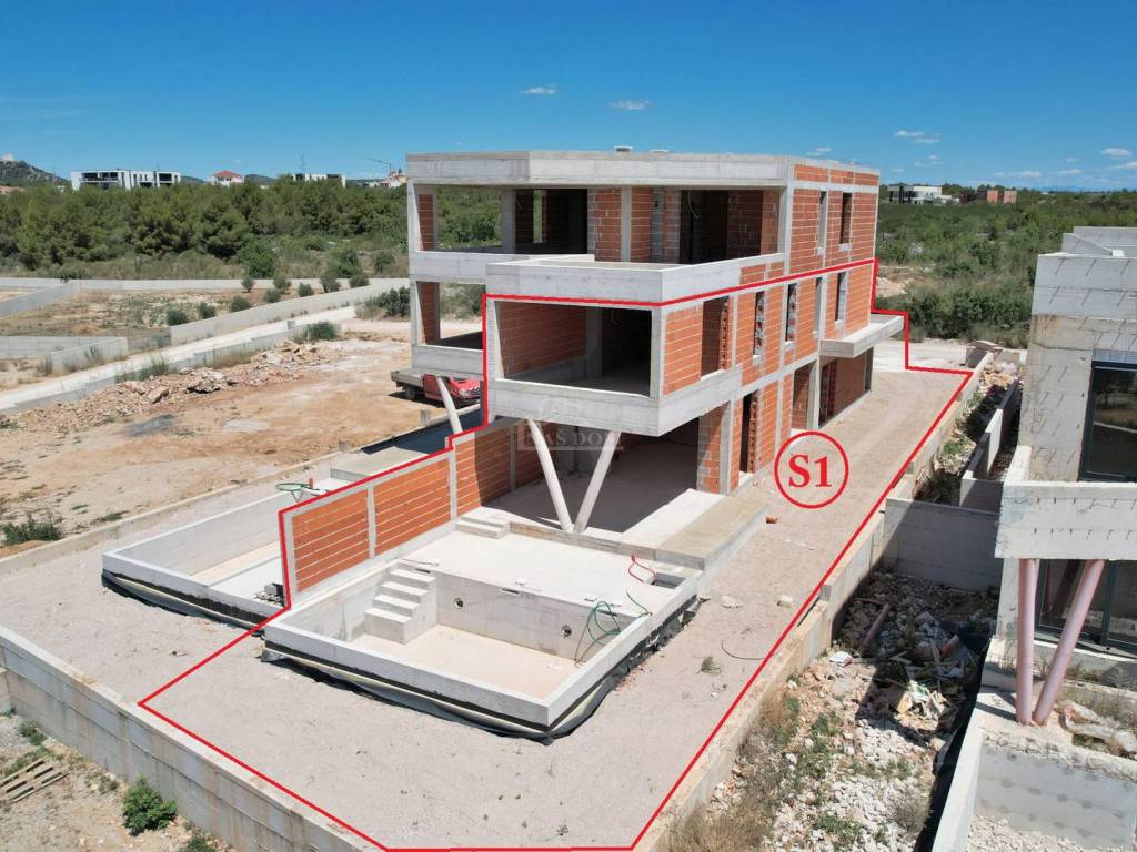 Luxury two-story apartment S1 with a pool and garden is located in a small building with a total of 4 residential units, with construction starting in February 2025 and planned occupancy in autumn 2026. The modern-looking building is being built according to the latest construction standards, with the investor focusing on luxury, quality, and comfort.