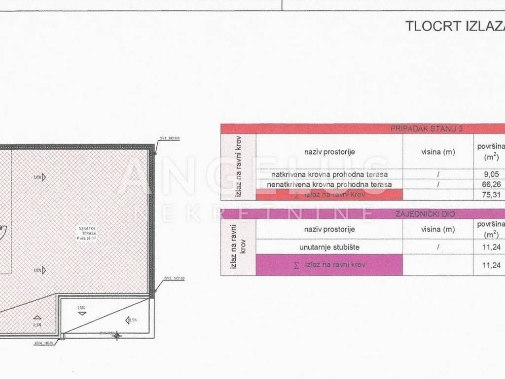 It also has 2 outdoor parking spaces, each with an area of 12.51 m2 (according to the calculation of 5.0 m2) and a roof terrace, partly covered 9.05 m2 and partly uncovered 66,26 m2 (total according to the calculation of 21,10 m2).