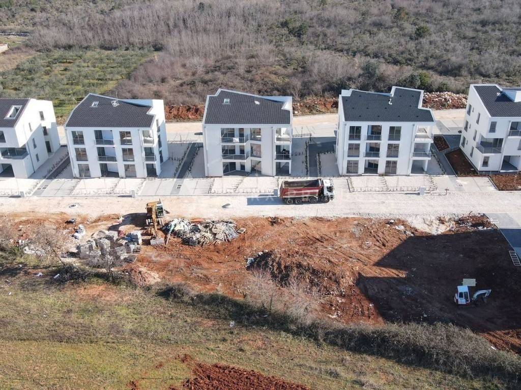 New apartments in Zambratija near the sea and beaches. The apartment consists of a living room with kitchen and dining room, terrace, 2 bedrooms, bathroom and loggia. The apartment has a parking space in front of the building. Air conditioning for heating/cooling installed.