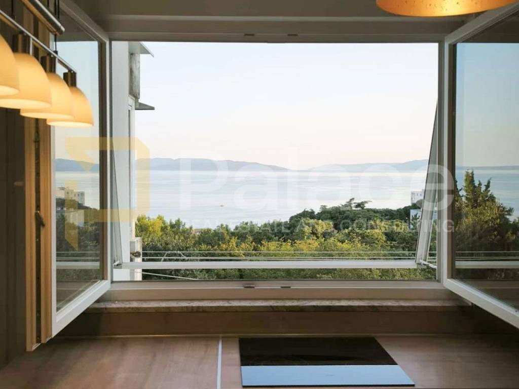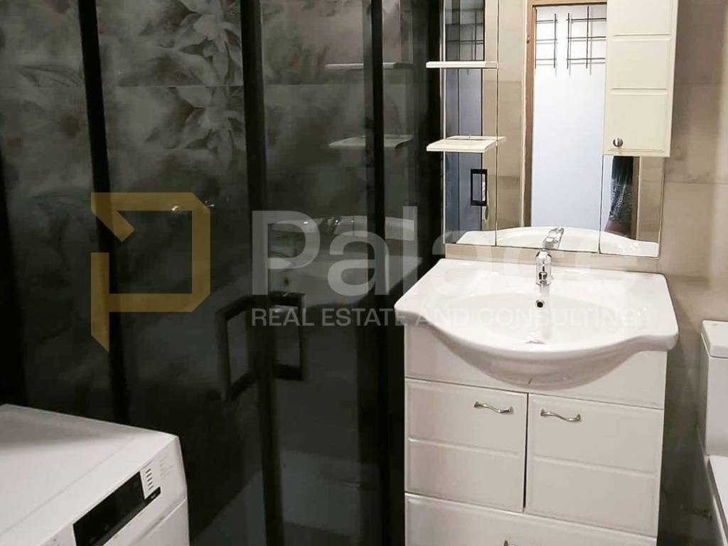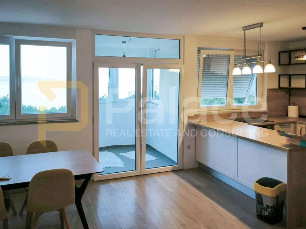The apartment consists of a south-facing living room and kitchen with access to a balcony/loggia, offering a beautiful sea view. The main bedroom is equipped with a large built-in wardrobe, while the kitchen and living room are furnished with modern and high-quality furniture. The bathroom has recently been completely renovated.
