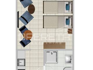 The studio apartment is designed as a single, open-plan space that combines the dining area and a fully equipped kitchen. A separate and well-appointed bathroom provides everything needed for daily use.