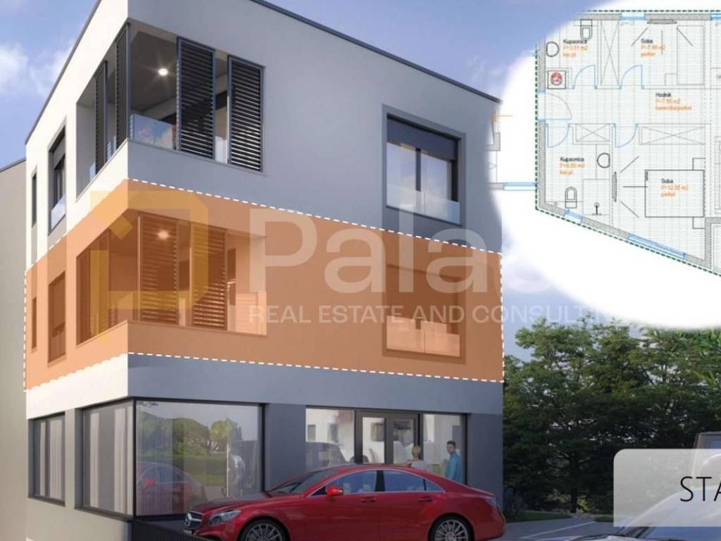 A three-bedroom apartment in a new building in Zadar is for sale, located in the quiet and sought-after neighborhood of Belafuža. The building is small and intimate, with a total of five apartments and a commercial space on the ground floor, and an elevator connecting the basement, ground floor, and upper floors.