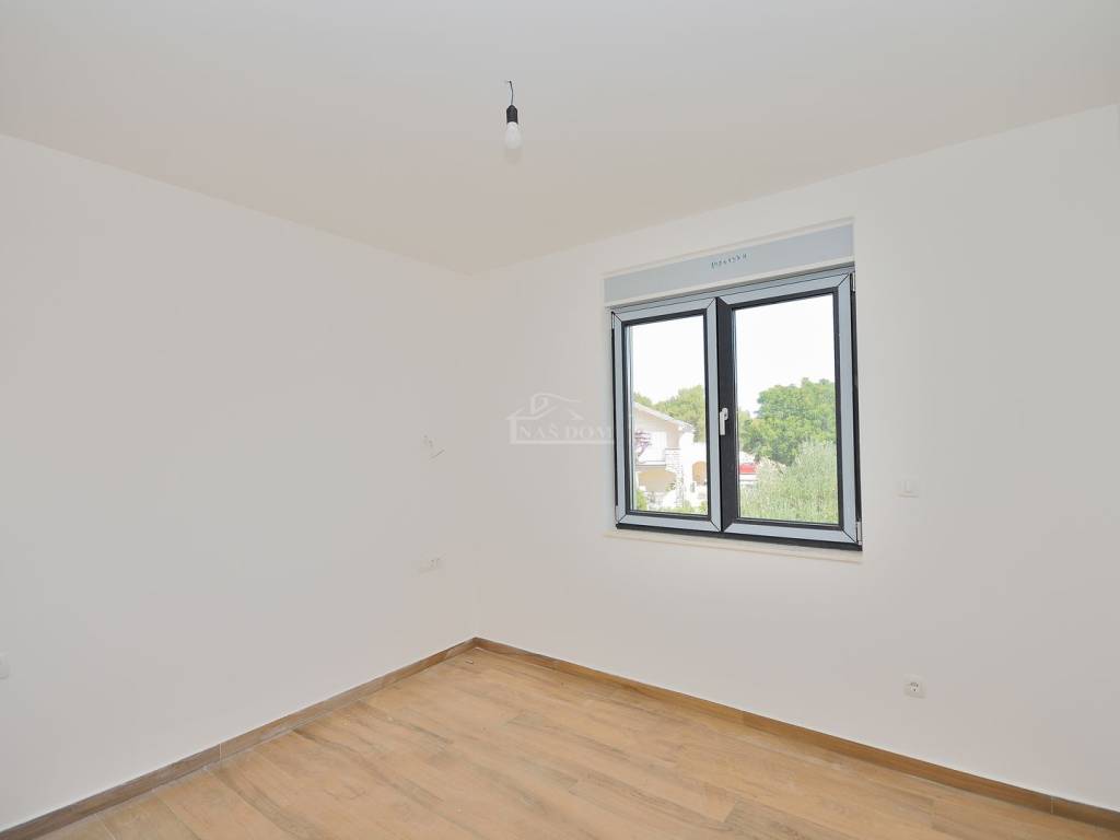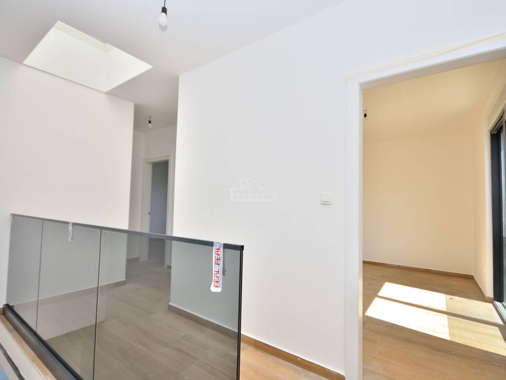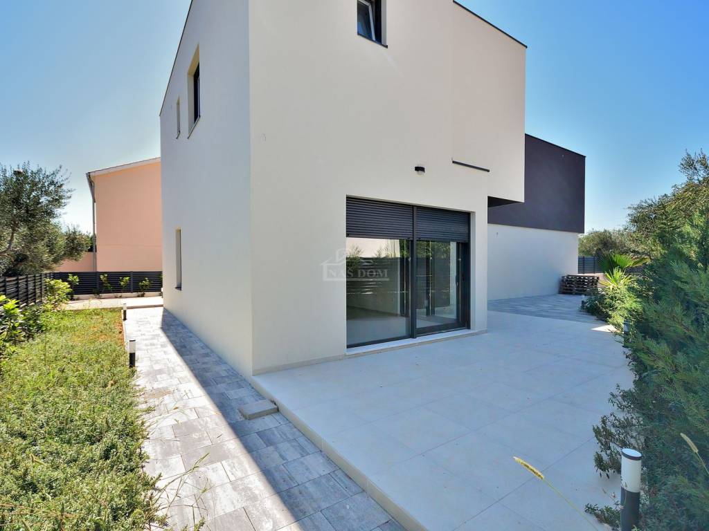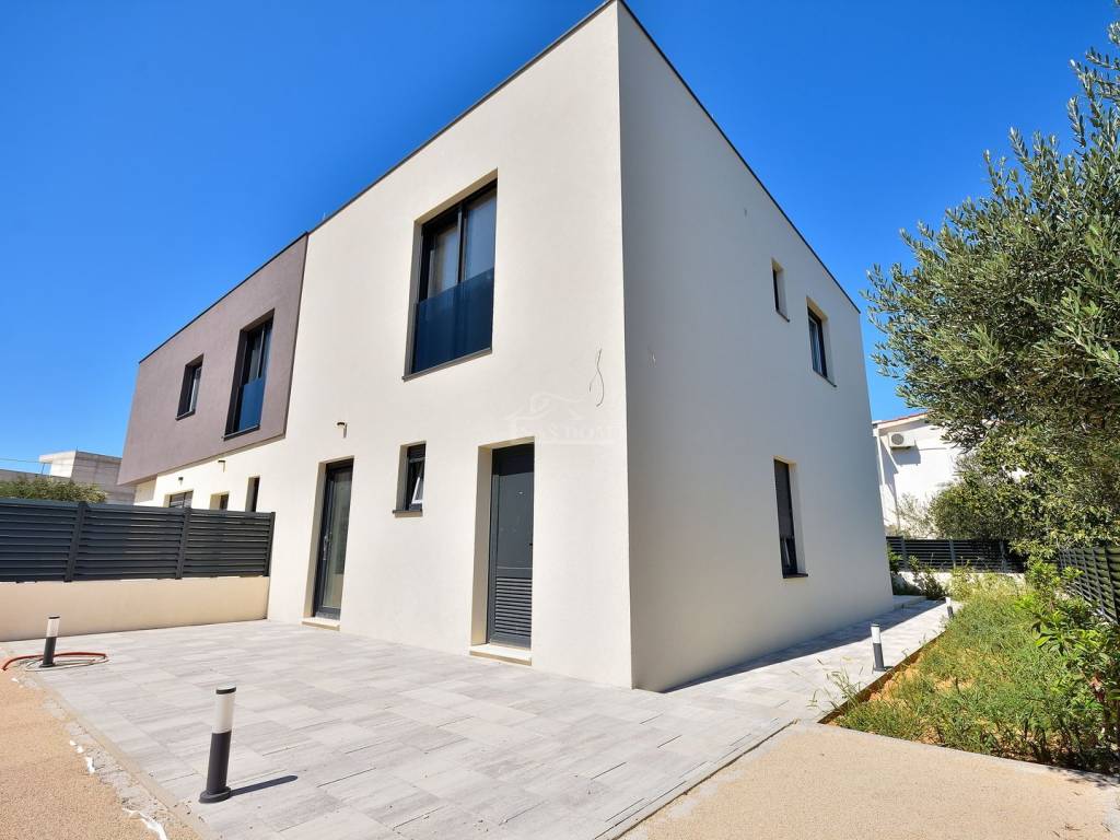 SRIMA, Vodice- **NOVOGRADNJA** *BLIZINA PLAŽE* -prodaje se dvojna kuća s bazenom na mirnoj lokaciji. S2 kuća moderne arhitekture ukupne stambene površine 134,22 m2 sastoji se od dvije etaže: prizemlje+kat. Prizemlje se sastoji od ulazni hodnik, wc, ostava, kuhinja, blagovaonica i dnevni boravak s izlazom na natkrivenu i nenatkrivenu terasu. Unutarnjim stubištem se ide na kat kuće koji se sastoji od: predsoblje, kupaonica, dvije spavaće sobe i master spavaća soba s vlastitom kupaonicom. Kući pripadaju dva parkirna mjesta i vrt površine cca 165m2 koji je jednim dijelom popločan.