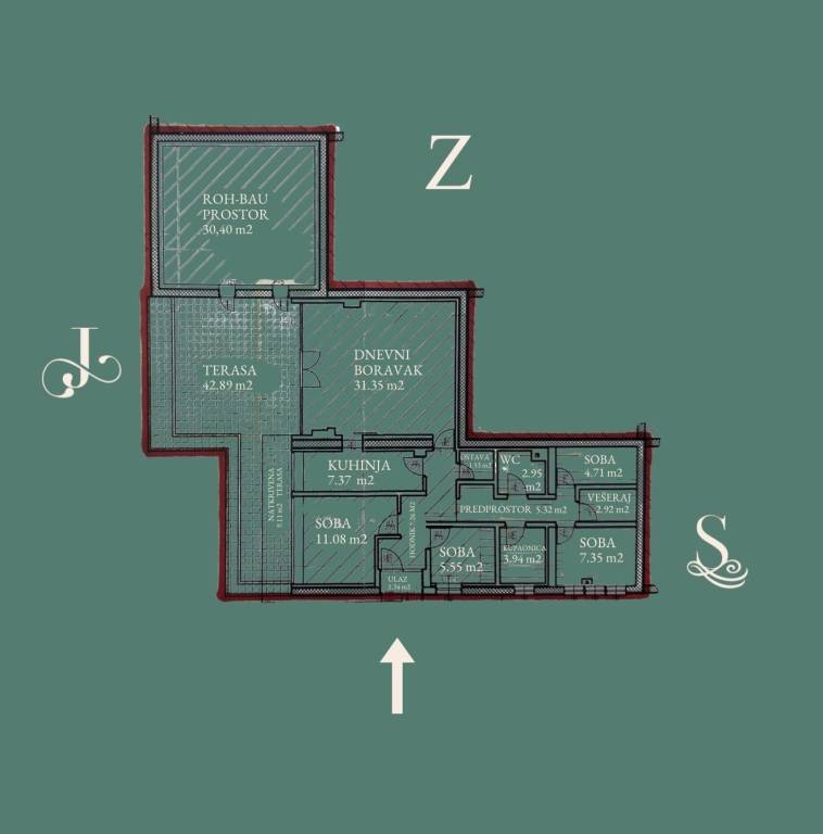 Tuškanac, elitni kvart, privatni ulazUkoliko tražite stan okupan svjetlom, u samom centru Zagreba, sa zasebnim privatnim ulazom, smješten u elitnom kvartu Tuškanac, vrhunske kvalitetne gradnje obrtnika zadruge Kooperativ s kraja 70-ih, uz potpunu zaštitu i sigurnost od potresa unutar 8 metara dubokih i 0.5 metara širokih armirano-betonskih nosivih temeljnih zidova, s atomskim skloništem smještenim ispred stana i orijentacijom na sunčanu južnu stranu - ovo je stan za Vas.Stan se sastoji od:predprostora 5.32 m2vešeraja 2.92 m2sobe 4.71 m2sobe 7.35 m2kupaonice 3.94 m2WC-a 2.95 m2ostave 1.53 m2sobe 5.55 m2dnevnog boravka 31.35 m2kuhinje 7.37 m2sobe 11.08 m2hodnika 7.26 m2ulaza 1.34 m2roh-bau prostora 30.40 m2 (s velikim potencijalom preuređenja)terase 42.89 m2 + natkrivene terase 9.11 m2Ukupno: više od 5 soba, 3 kupaonice, dodatne pomoćne prostorije i velika terasa.Posebnosti:svi pregradni zidovi dostupni za rušenje i preoblikovanje prostora po željimogućnost proširenja postojećih otvora unutar nosivih zidovauvučena zgrada okružena drvećem, bez zvukova prometauvijek dostupan besplatan javni parking (zapadni i istočni prilaz zgradi)uredno vlasništvo 1/1, prvi vlasnikLokacija: