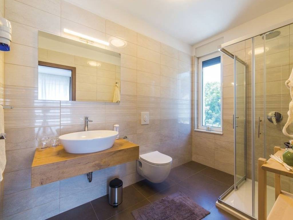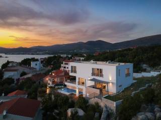 Villa on the island of Ciovo for sale. Only 80 meters from the sea, raised above a small and quiet village on a plot of 552 m2, offers a beautiful open panoramic view of the sea and islands. Given its location, it provides a dose of intimacy and is ideal for relaxation and rest. The total living area is 252 m2 spread over three floors. The first floor is reserved for relaxation facilities such as sauna, jacuzzi for three people and a large outdoor heated pool of 33 m2. On the second floor there is a large living room with glass walls through a beautiful sea view, large kitchen with dining table , one restroom, and one room with bathroom. The dining room has access to a beautiful outdoor terrace. On the third floor there are four bedrooms, each with its own bathroom. The villa was built and completed in 2018. Distance from Trogir 8 km, while the distance from Resnik Airport is only 9 km.