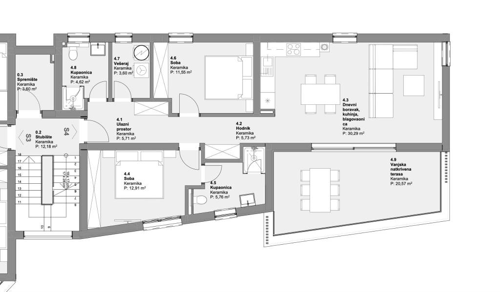 Apartment S4 is located on the 1st floor of the building, covering 80.17 m2 of internal living area + 20.57 m2 of covered terrace. It consists of 2 bedrooms, an open space living room, kitchen and dining area, 2 bathrooms with toilets, laundry room, entrance hallway, and covered terrace. The apartment also includes an outdoor parking space (included in the price). The total calculated / saleable floor area of the apartment is 90.45 m2 (the covered terrace is calculated with a coefficient of 0.5).