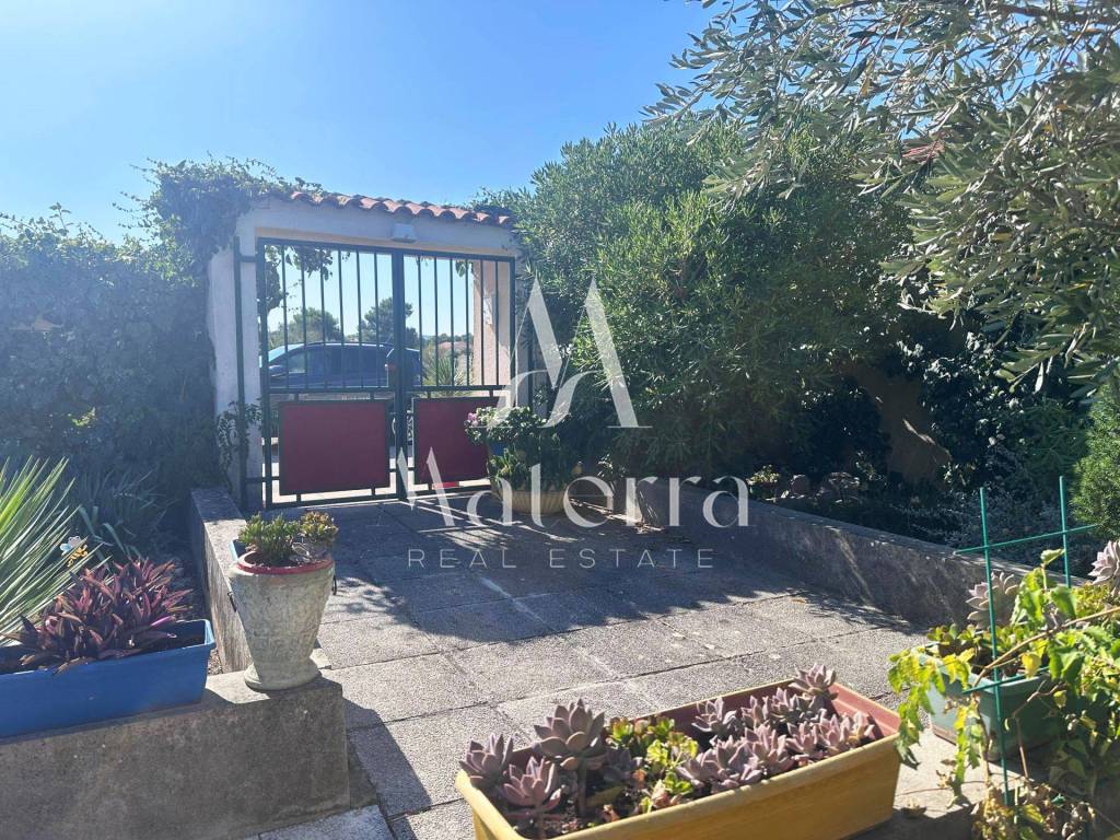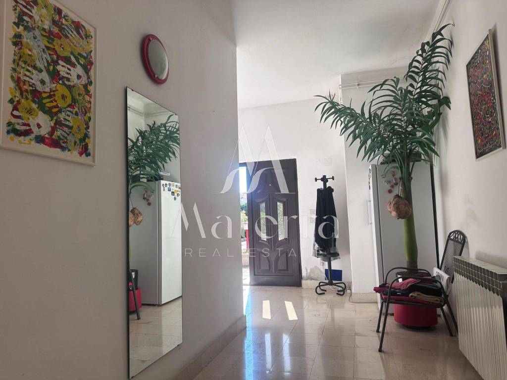 The plot of 750 m² includes the main house, two garages, an outdoor kitchen, and a beautifully landscaped garden with Mediterranean plants. The house has two separate entrances. The ground floor entrance leads to the kitchen, dining room, living area, bathroom, and a technical room with a central heating system. An internal staircase connects the basement and the upper floors.
