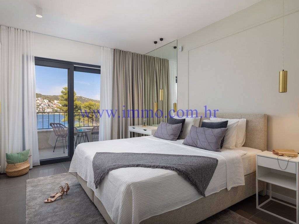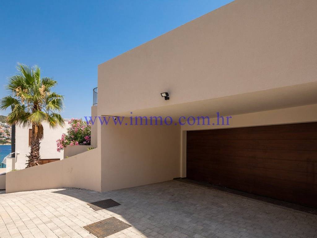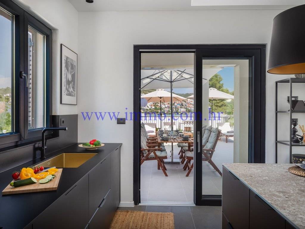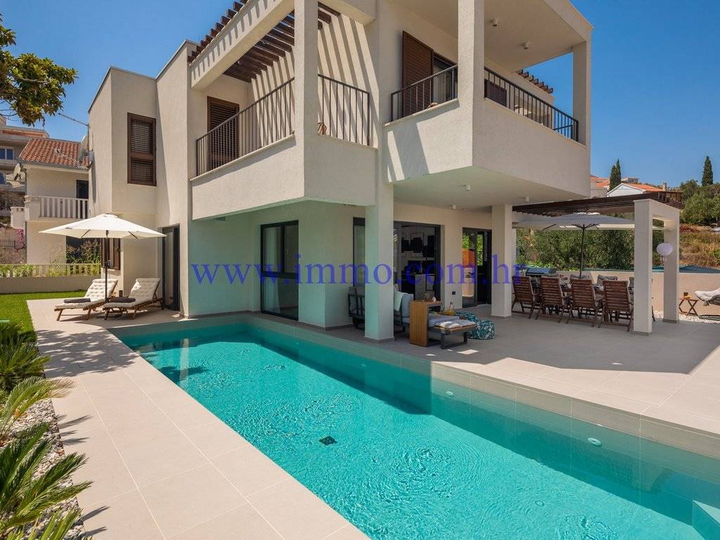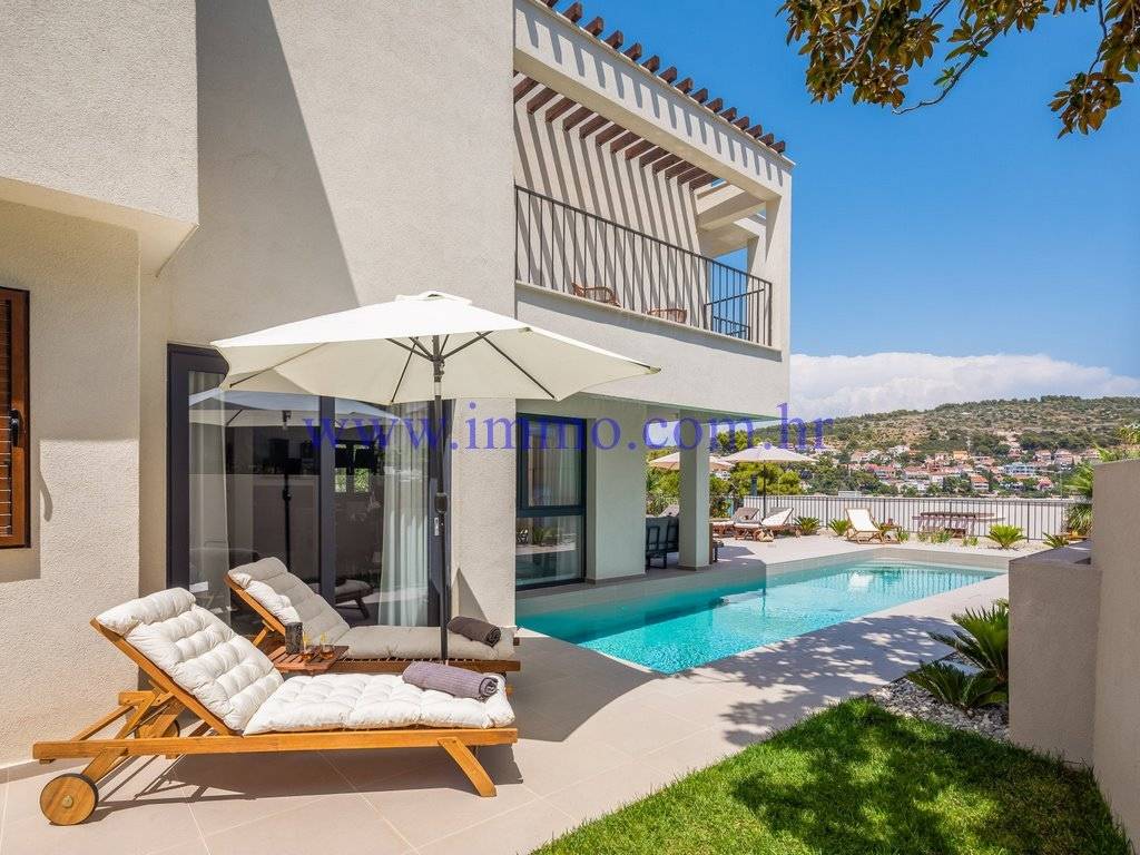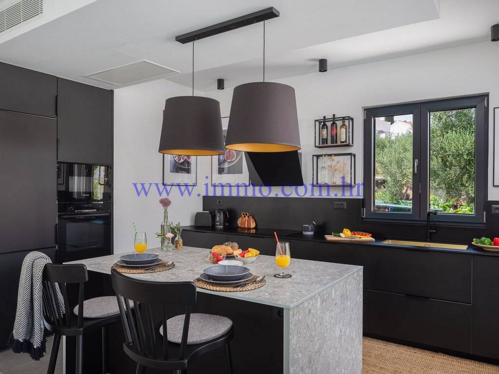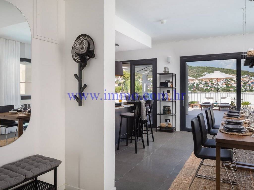 A new luxury villa is for sale, located in an exceptional location on the southern side of the island of Čiovo, just steps from the azure sea and a beautiful pebble beach with fine gravel. The villa, with an area of 290 m2, is built from the highest quality materials, tastefully furnished and equipped with modern furniture and appliances. The villa has a security alarm and video surveillance cameras, underfloor heating in the bathrooms, and air conditioning units in the rooms.