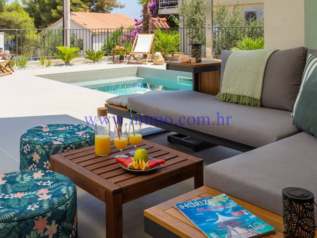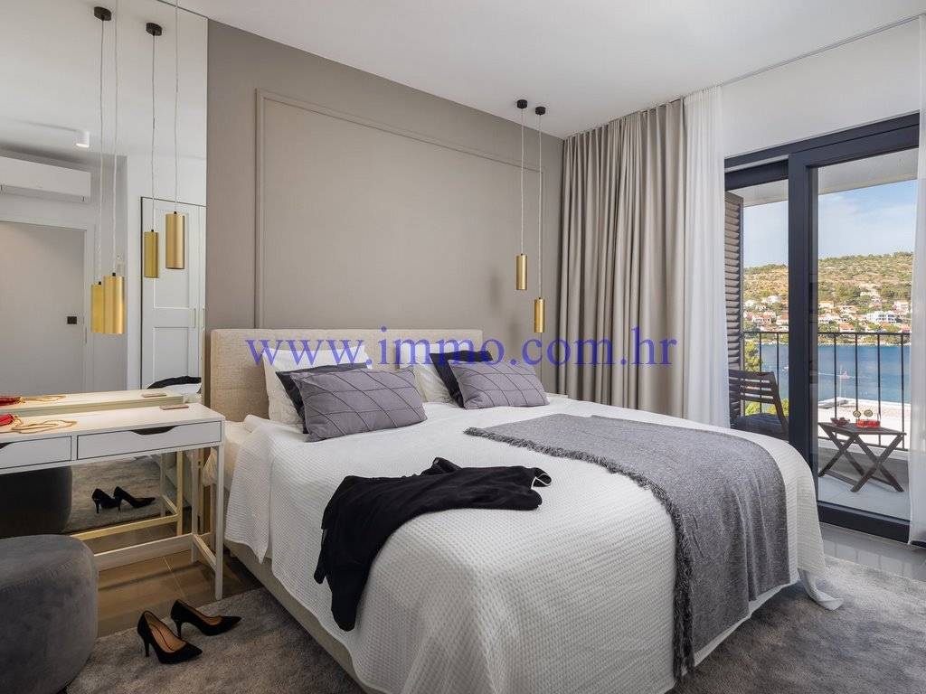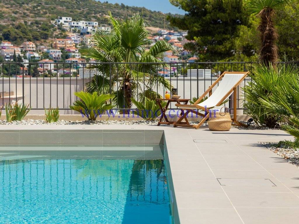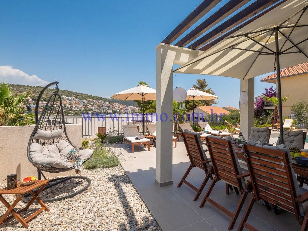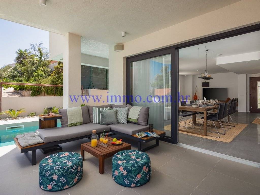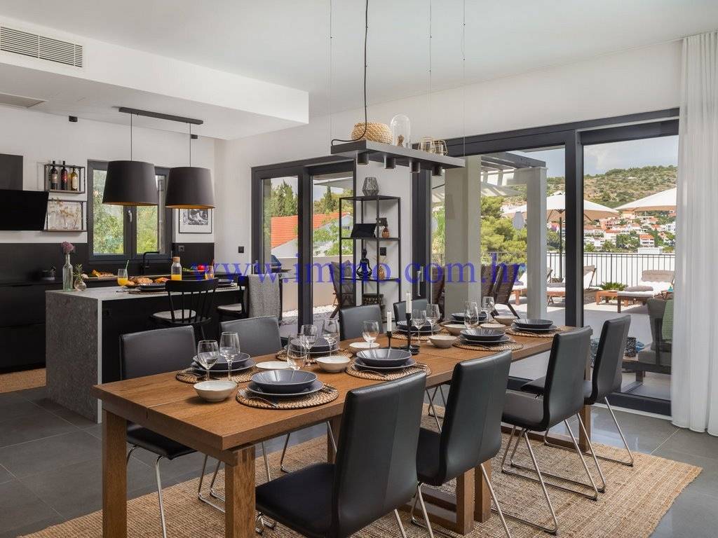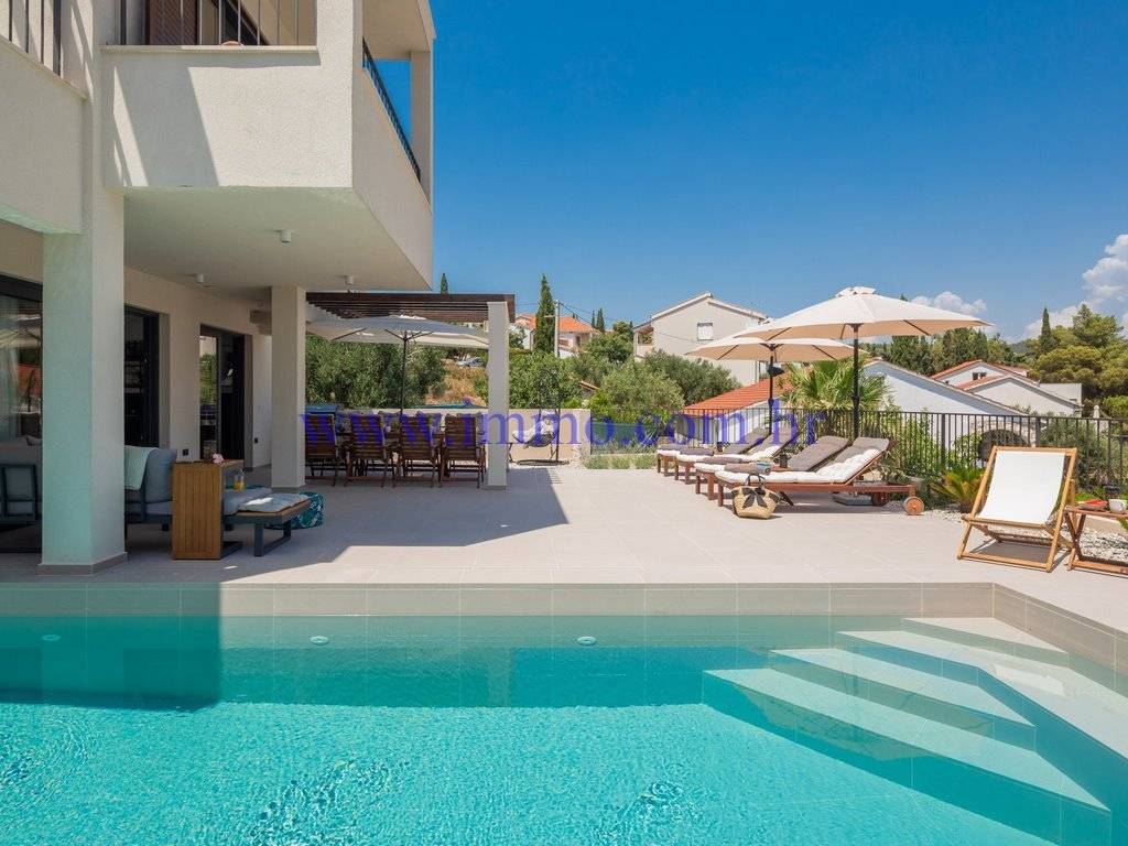 A new luxury villa is for sale, located in an exceptional location on the southern side of the island of Čiovo, just steps from the azure sea and a beautiful pebble beach with fine gravel. The villa, with an area of 290 m2, is built from the highest quality materials, tastefully furnished and equipped with modern furniture and appliances. The villa has a security alarm and video surveillance cameras, underfloor heating in the bathrooms, and air conditioning units in the rooms.