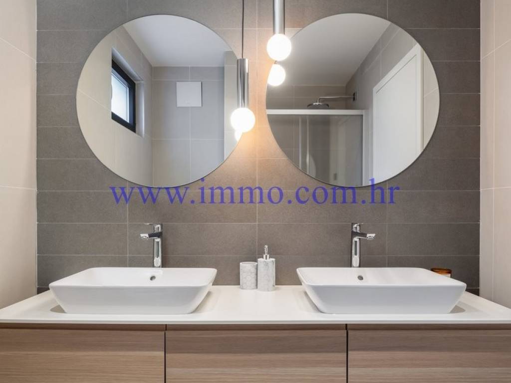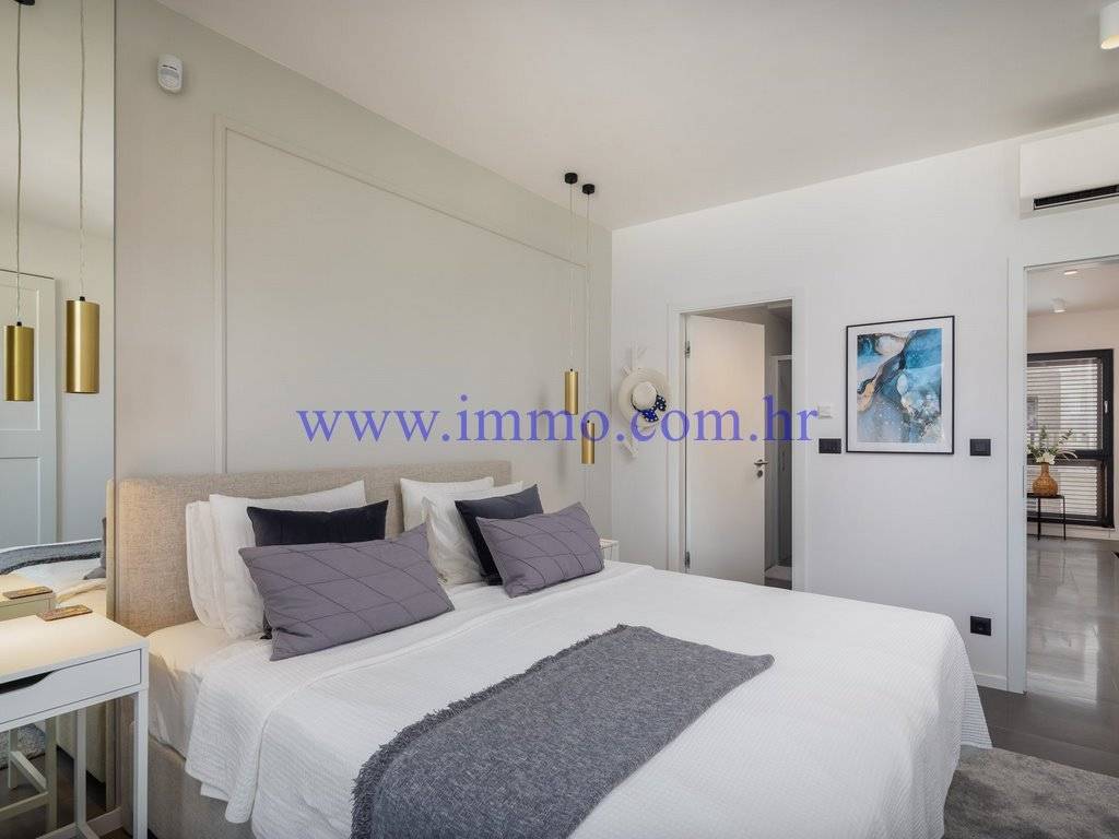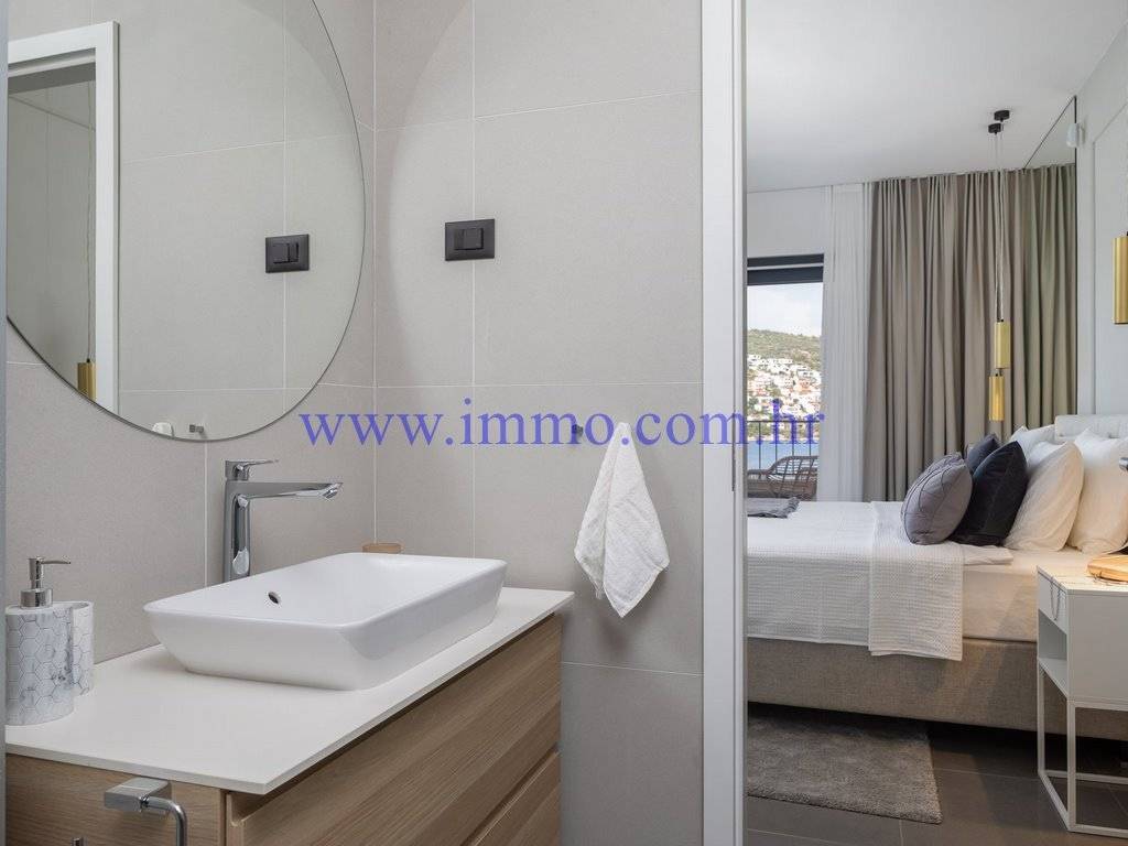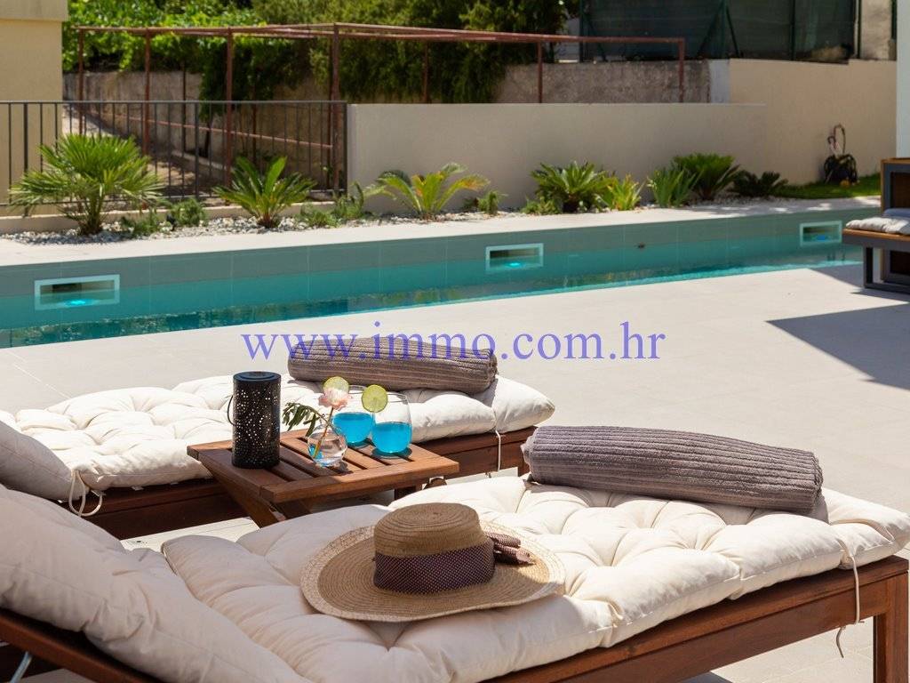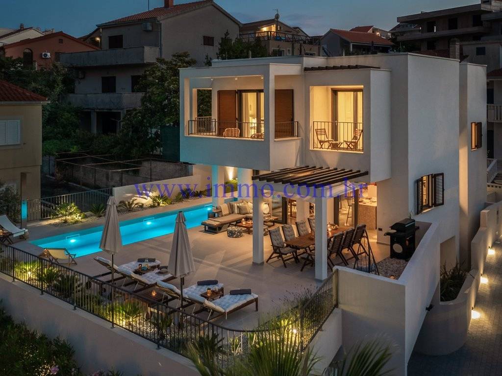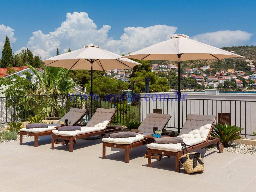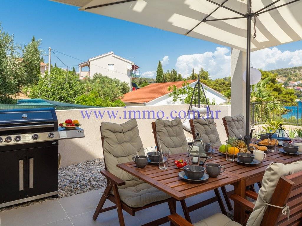 A new luxury villa is for sale, located in an exceptional location on the southern side of the island of Čiovo, just steps from the azure sea and a beautiful pebble beach with fine gravel. The villa, with an area of 290 m2, is built from the highest quality materials, tastefully furnished and equipped with modern furniture and appliances. The villa has a security alarm and video surveillance cameras, underfloor heating in the bathrooms, and air conditioning units in the rooms.