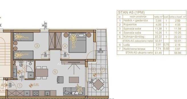 New Construction!A building with only 10 apartments - 2 entrances (5 apartments per entrance).We offer an apartment on the 2nd floor of the new building, which consists of a hallway with a wardrobe, a bathroom, two bedrooms, a kitchen with a dining area, a living room, and a covered terrace.The apartment includes the following features:- Electric underfloor heating in the bathroom and living area- Electric water heater in the bathroom- Air conditioning (inverter) in the living room- Glass railing on the terrace- Covered parking spaceThe building will be ready for occupancy in March 2026.Co-ownership.The apartment is located near the sandy beach in Medulin.Close to a pharmacy, cafes, and restaurants.The future buyer does not pay property transfer tax.INFO: jelena@alma-nekretnine.com+385 98 323 264