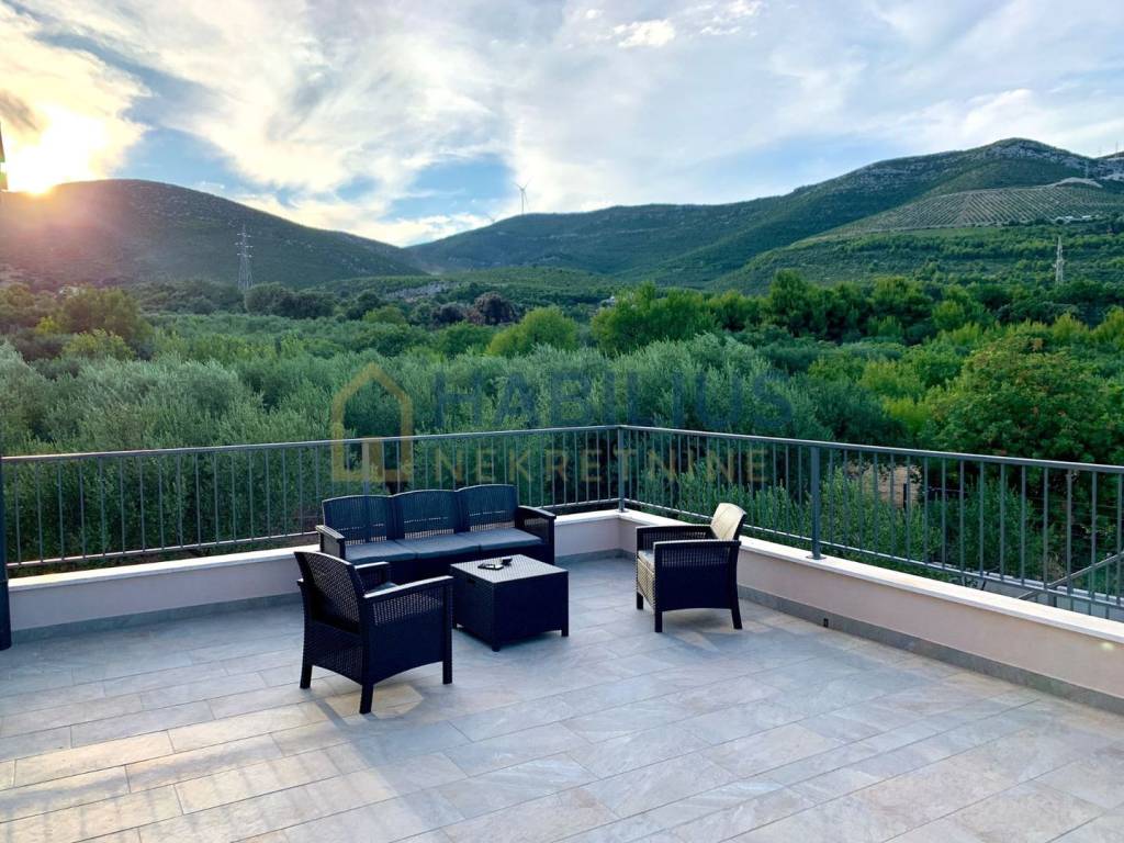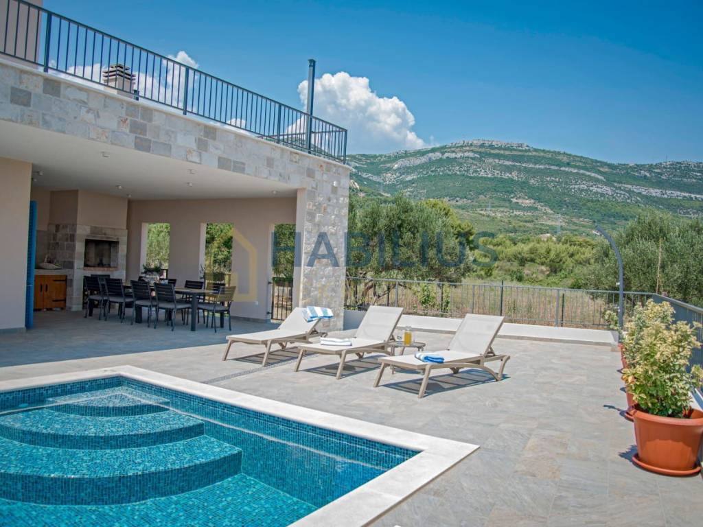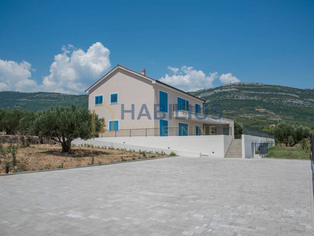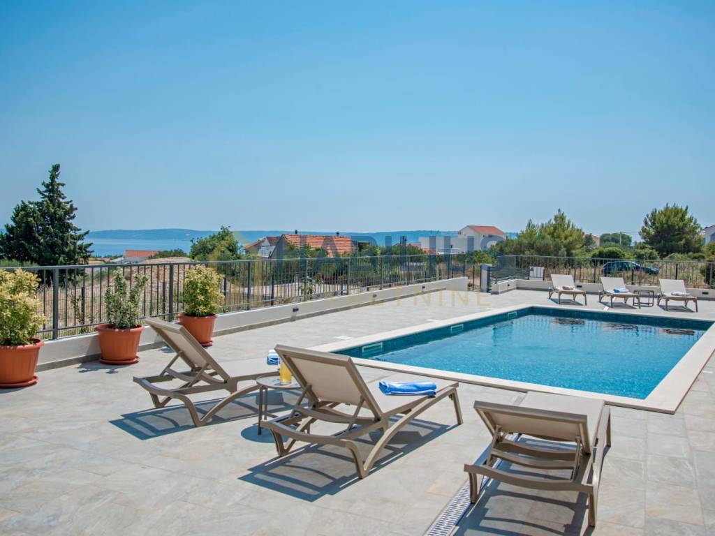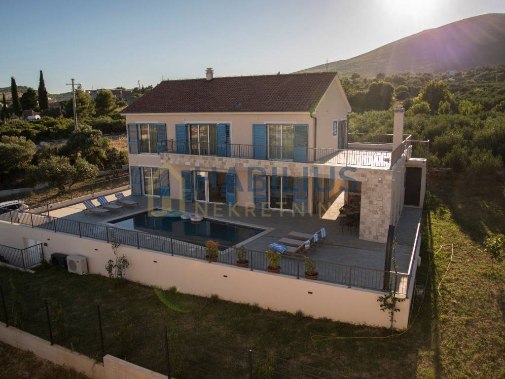 Predivna novoizgrađena dvokatnica sa grijanim bazenom, dizajnirana da se uklapa sa prirodnom ljepotom okruženja, smještena u Kastelima, na blagoj uzvisini gdje se pruža otvoren pogled na Split, more i otoke...