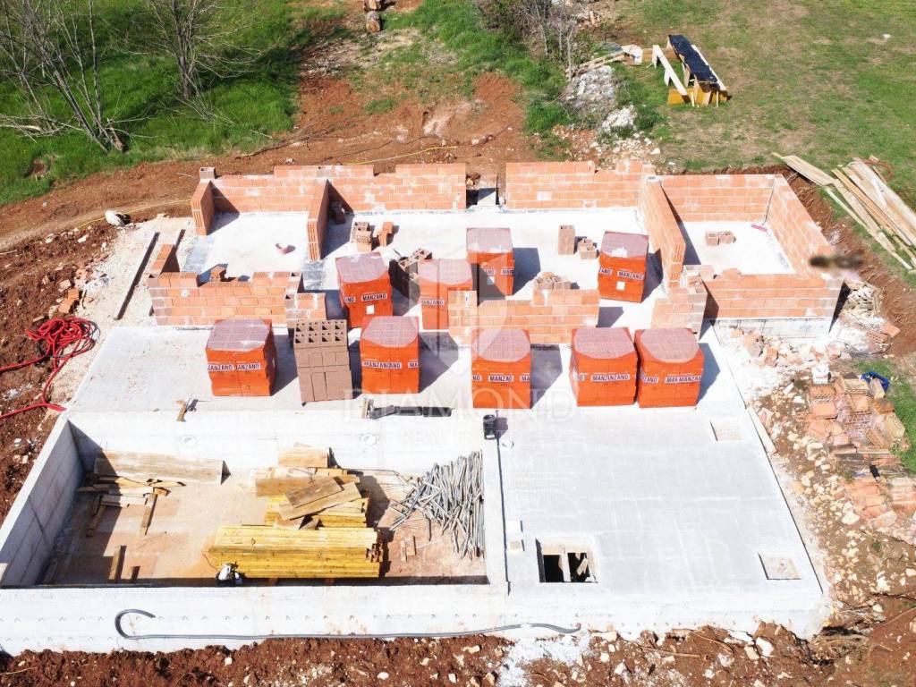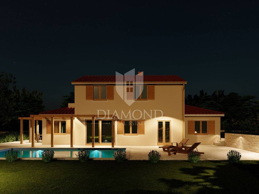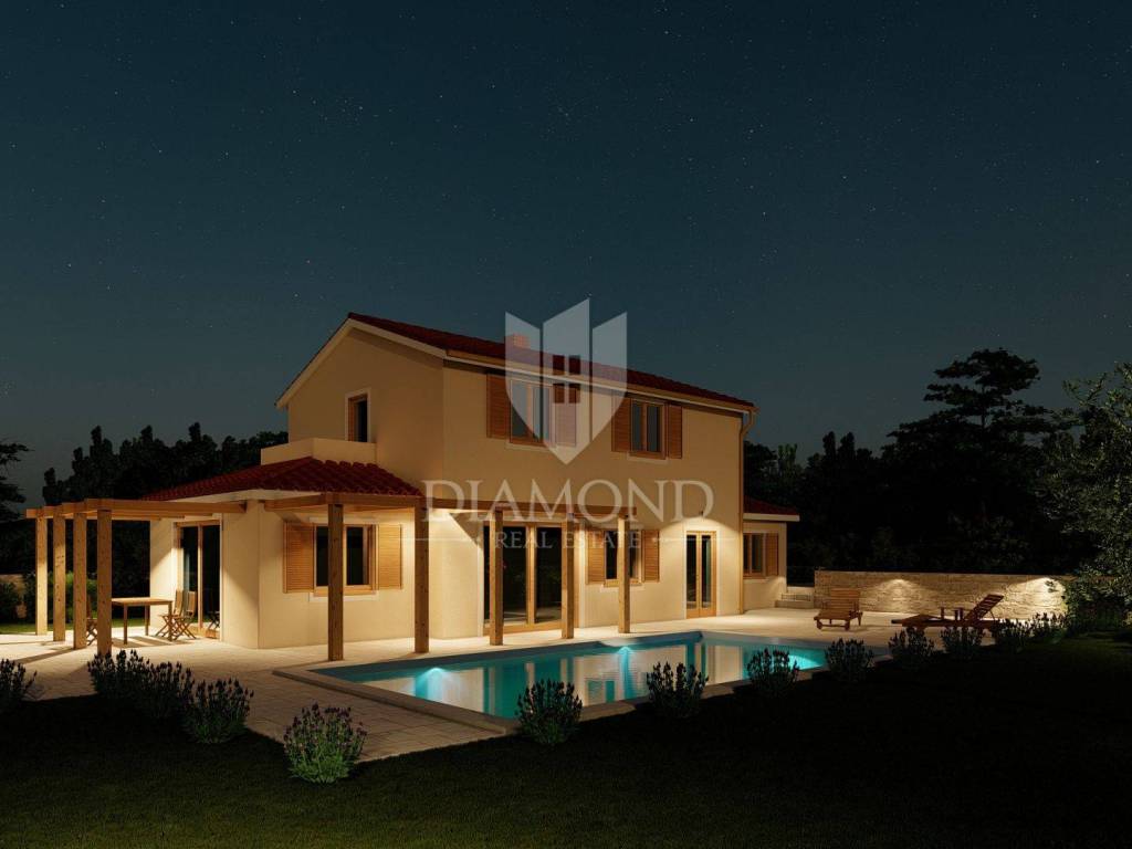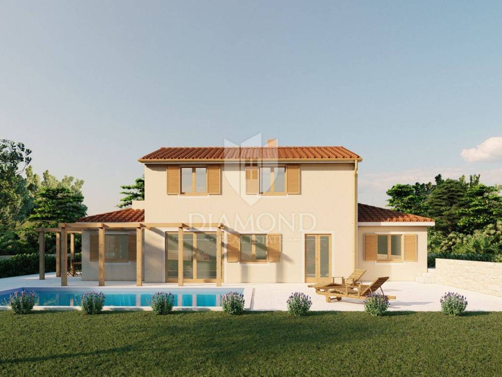 In the peaceful surroundings of Poreč, on the edge of a settlement, lies this modern villa with a spacious 960 m² plot and a total living area of 152 m². The house spans two floors: the ground floor features an entrance hallway, a living room, and an open-concept kitchen with a dining area, a bedroom with a private bathroom, and a guest toilet. The upper floor includes two more spacious bedrooms, each with an en-suite bathroom and a balcony offering stunning panoramic views of nature. The living area extends to a large covered terrace leading to a well-maintained garden with a 42 m² swimming pool and a sunbathing area.