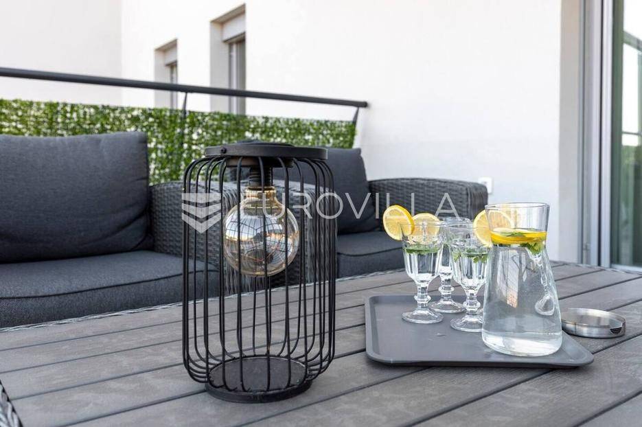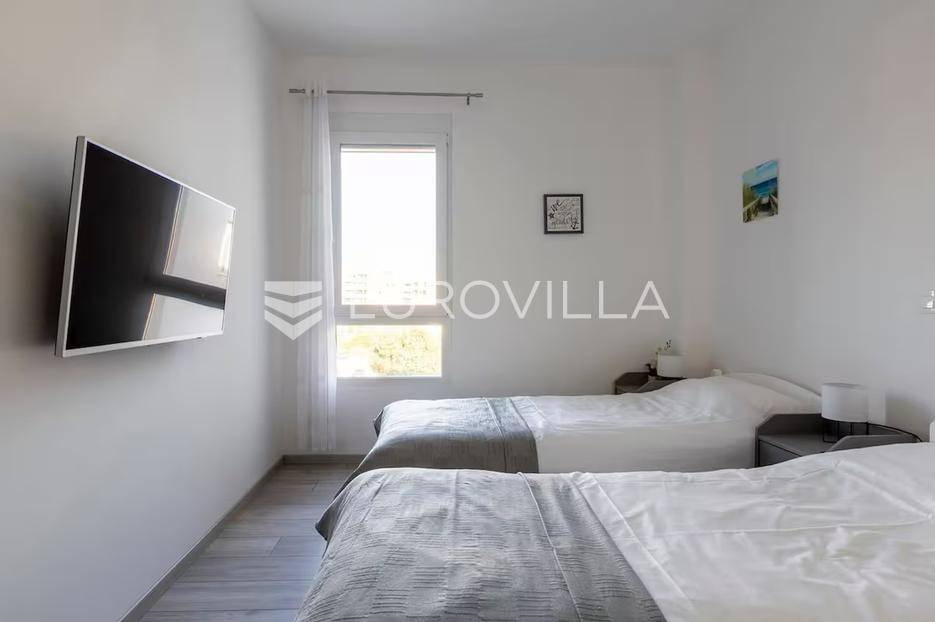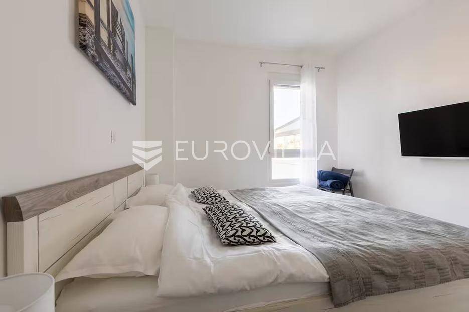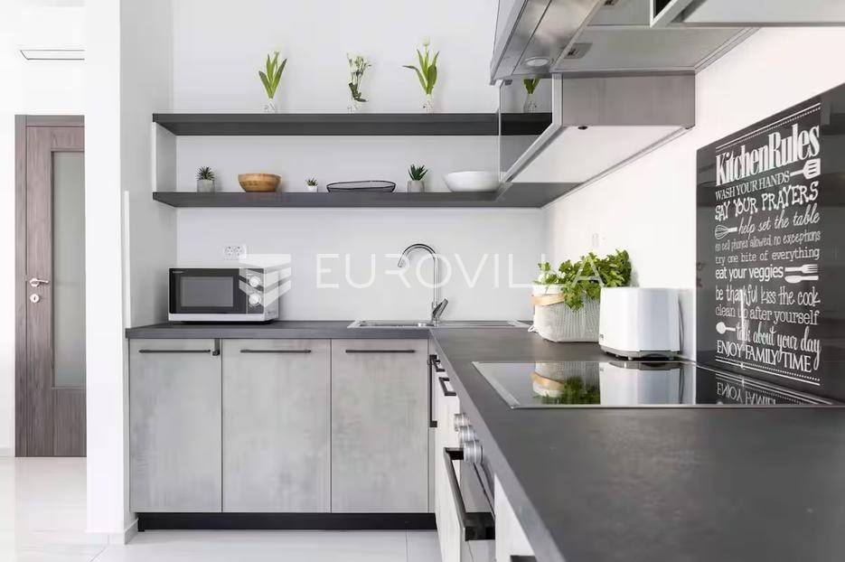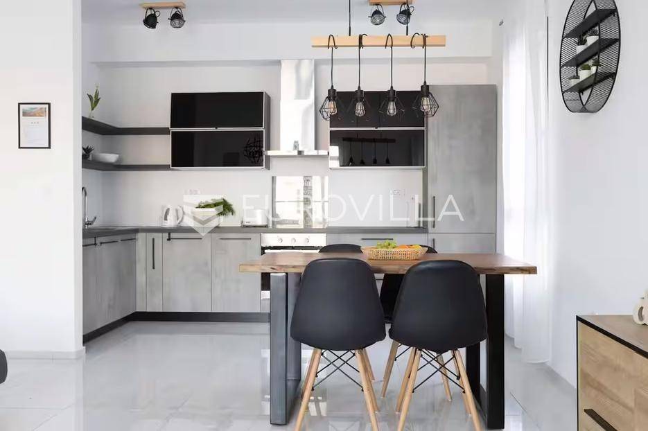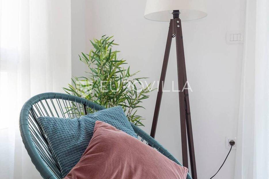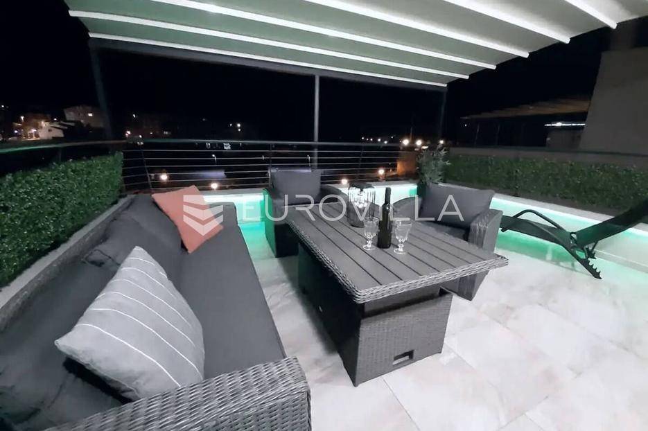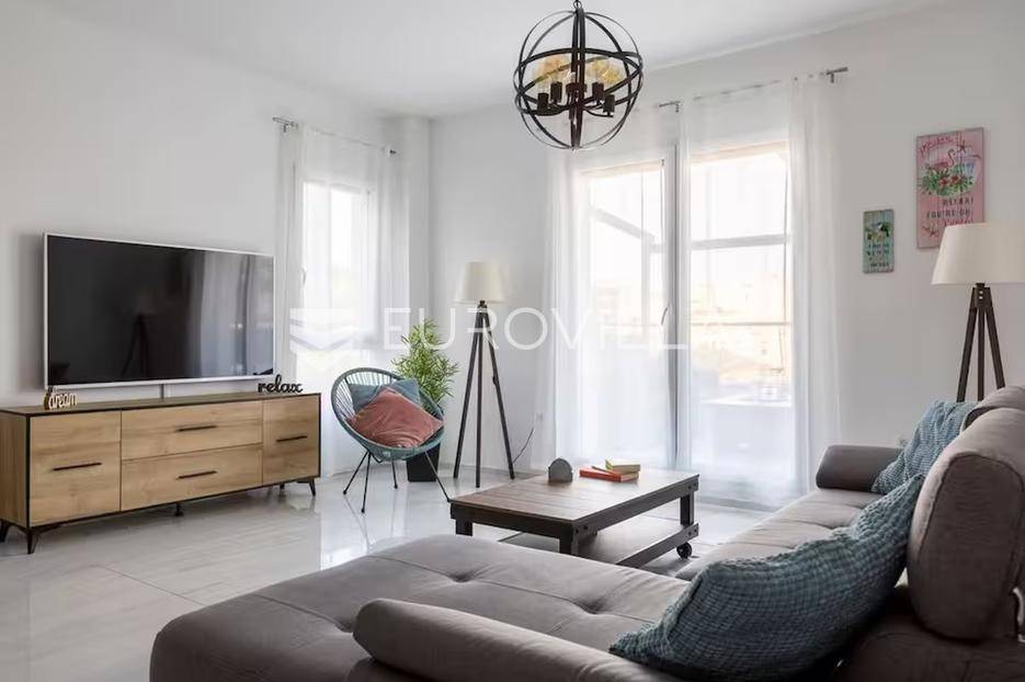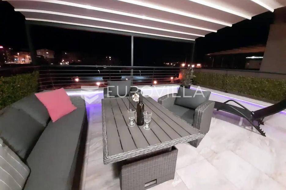U središtu grada na najboljoj gradskoj lokaciji nalazi se ovaj moderan u potpunosti elegantno opremljen stan NKP 85 m2 smjesten na trećem katu stambene zgrade s liftom.Stan se sastoji od ulaznog dijela, dvije komforne spavaće sobe, velikog dnevnog boravka s izlaskom na natkrivenu terasu od 20 m2 idealnu za odmor od dnevnih obaveza i popodnevno opuštanje. Moderna kuhinja u potpunosti je opremljena svim najsuvremenijim kućanskim aparatima. Na raspolaganju je i kupaona i spremište kao dodatan prostor.U svim sobama su postavljeni smart home televizori, kao i u dnevnom boravku. Tri inverter klime za hlađenje i grijanje, iako je u cijelom stanu postavljeno podno grijanje. Sve su roletne električne, te su postavljeni i komarnici u svim prostorijama. Vanjska stakla prozora su fotosenzibilna i osiguravaju dodatnu zaštitu od sunca.Stanu pripada i jedno vanjsko parkirno mjesto koje je svakako velika prednost u centru grada.Kao dodatna pogodnost, osim mogućnosti dugoročnog najma, stan se može iznajmiti i na period od 6 mjeseci.Sveobuhvatno se dodatno plaćaju režije u iznosu od 130 eura.Za više informacija organizaciju razgleda slobodno nas kontaktirajte.