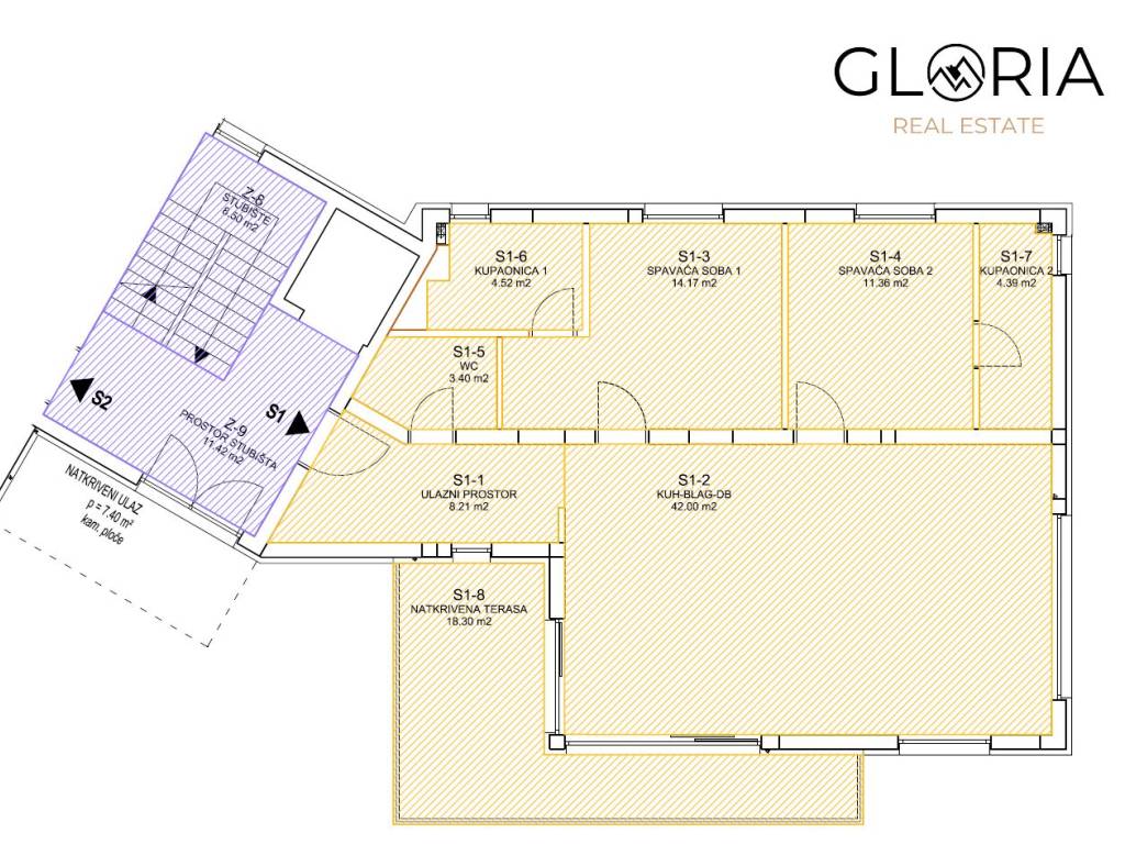 Zgrada se sastoji od podruma, prizemlja, dva kata i nadgrađa na kojima je smješteno ukupno 7 luksuznih stanova. U podrumu se nalazi velika garaža (67,90 m2) koja pripada penthouse stanu oznake S7 te ostave koje pripadaju stanovima i zajednička teretana s kupaonicom koja predstavlja zajednički sadržaj koji pripada svim stanarima. Na prizemlju i prvom katu se nalaze po dva kata, dok drugi kat s nadgrađem u cijelosti čini jedan stan – penthouse.