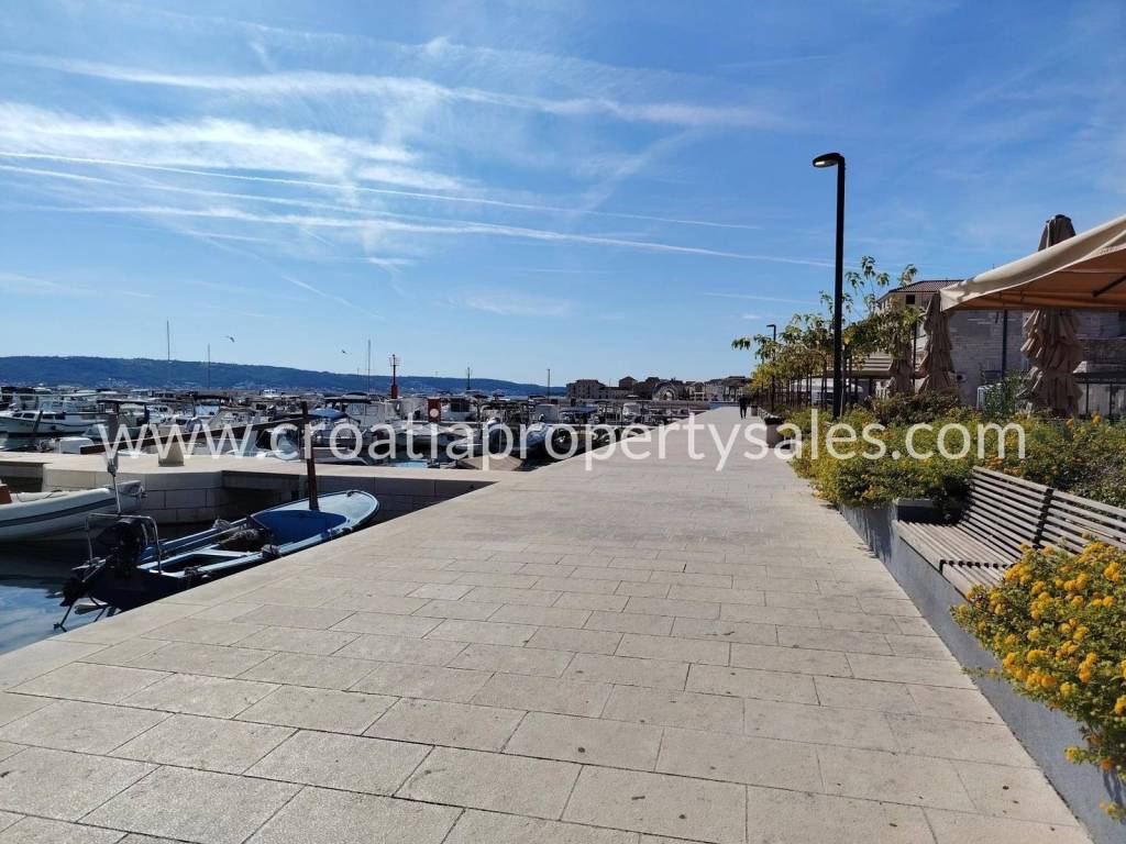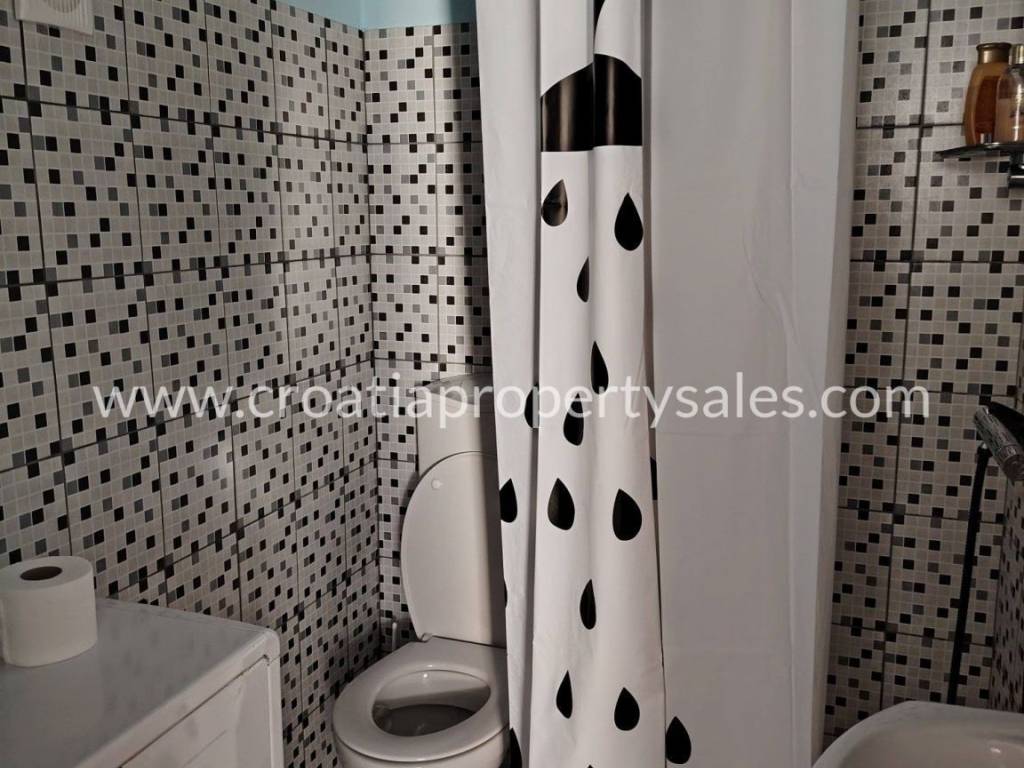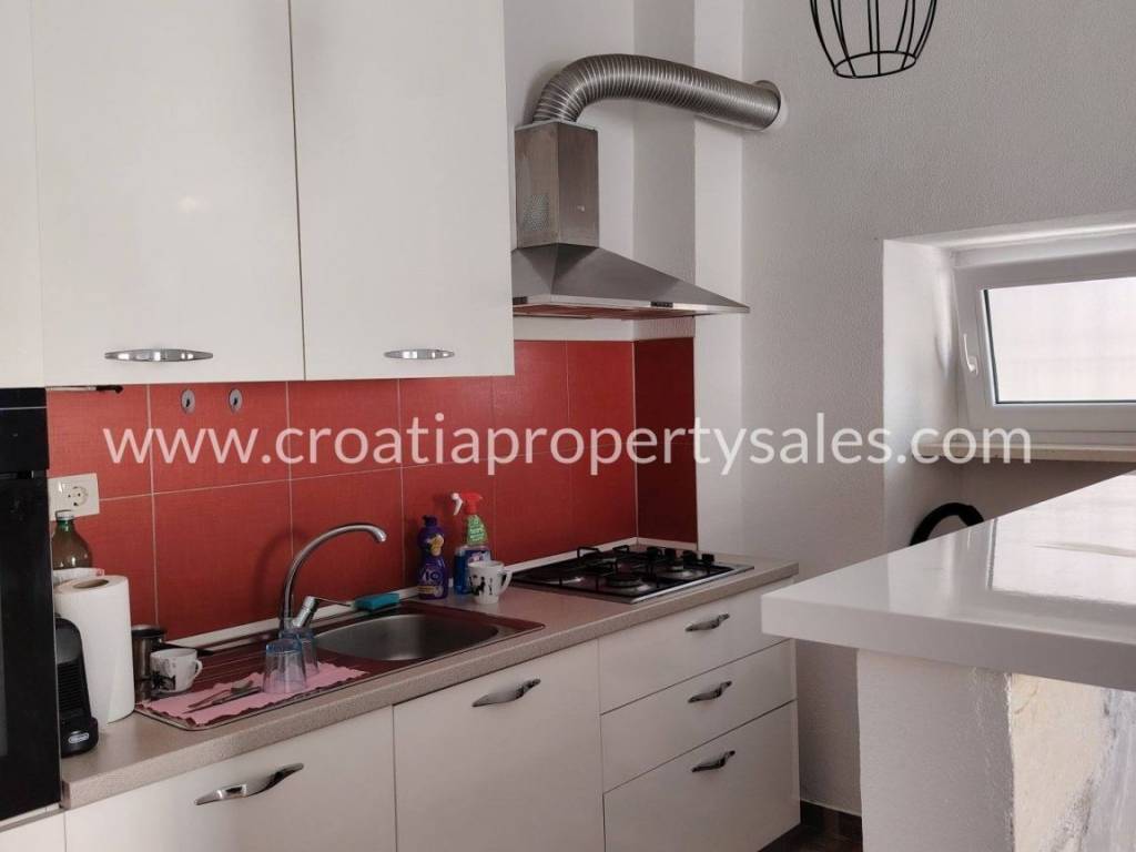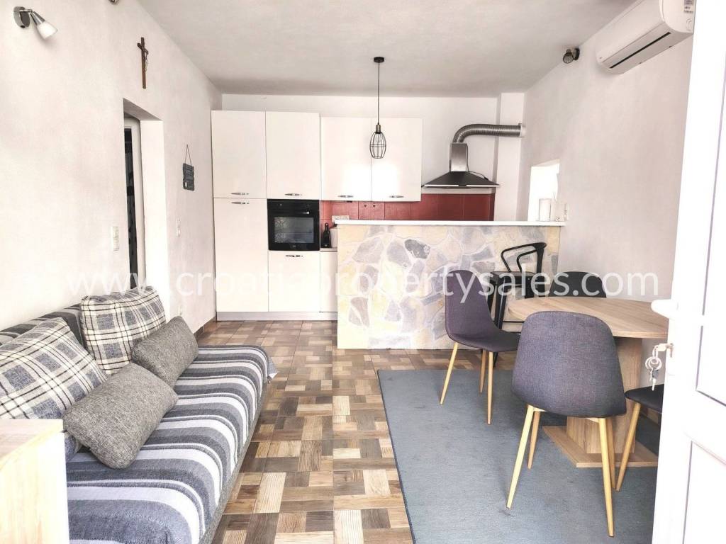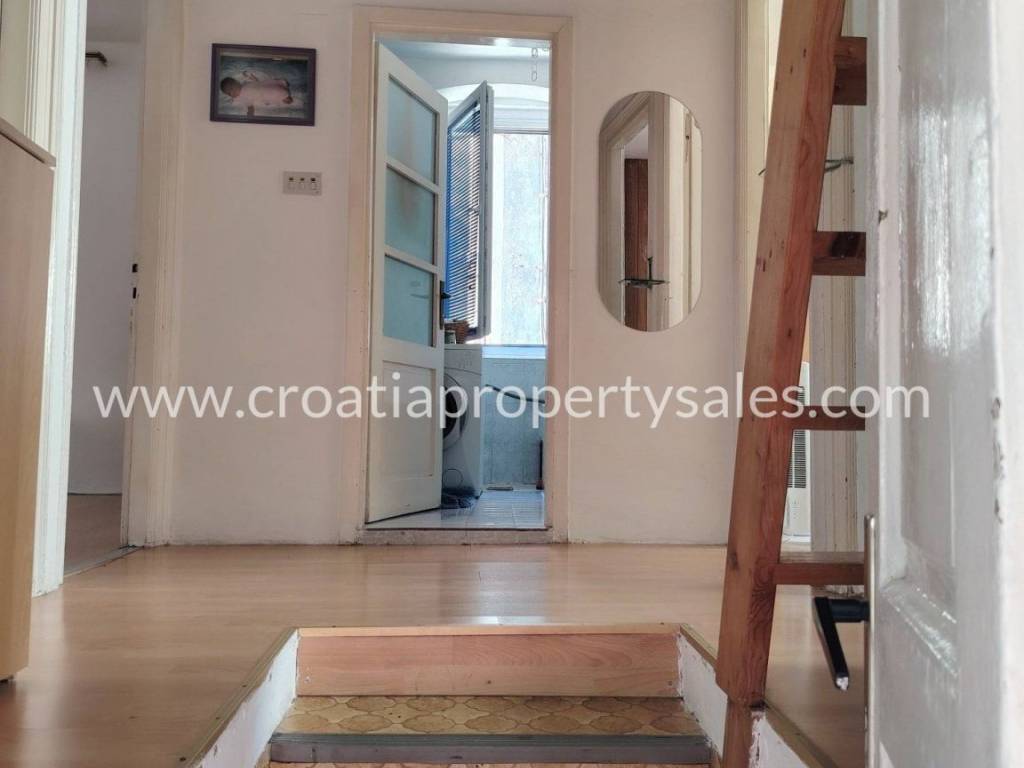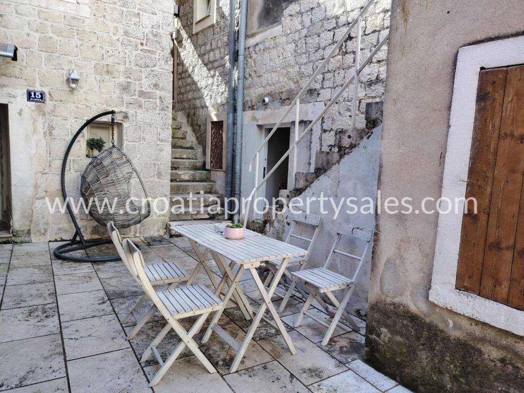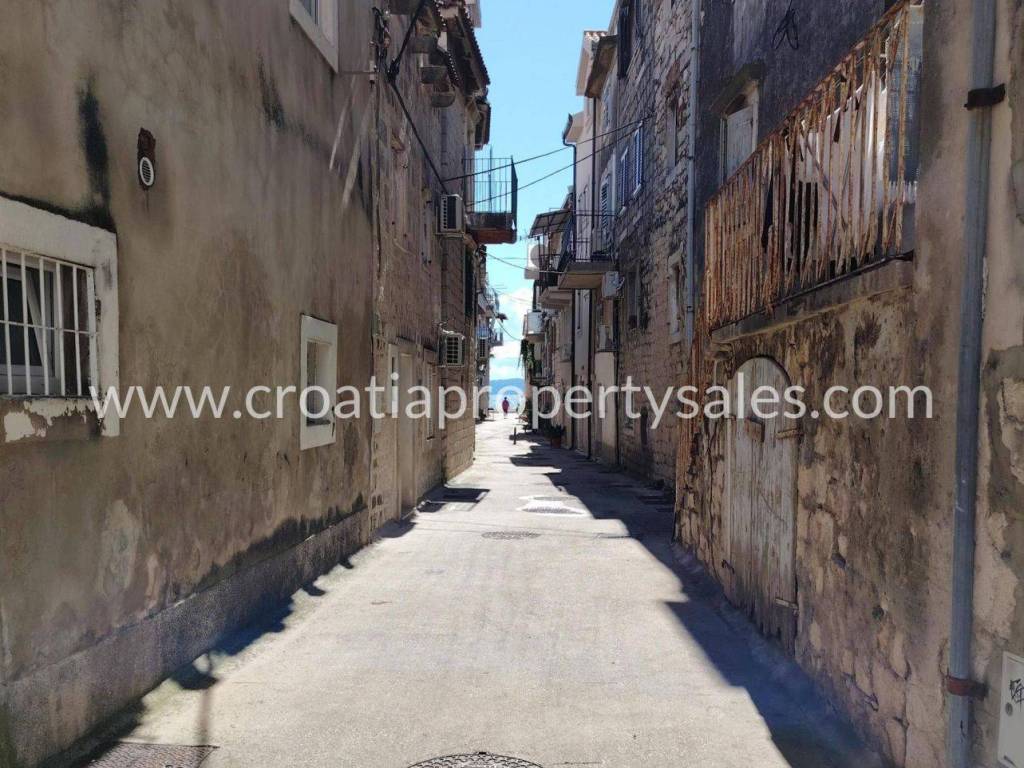 A terraced house in the center of a small town just 100 m from the sea.The house has two floors and attic. At the northern entrance on the ground floor there is an apartment as a separate unit. It consists of a bedroom, bathroom, living room with kitchen and dining room.On the eastern side of the ground floor there is another separate unit that has a kitchen, pantry and bathroom in use at the moment, but can be converted into an apartment.External stairs lead to the apartment on the first floor, which consists of a spacious hallway, three large bedrooms, kitchen and bathroom. The apartment has large openings and lots of light. Partial renovation is required.In front of the house there is a courtyard with a seating area. There is also a barbecue and an outdoor well. The courtyard is shared with neighboring houses.The house does not have a parking space, but it is possible to park on a public area nearby.Only 100 m from the house is the Riva and the town promenade, and restaurants, cafes and supermarkets are within walking distance.