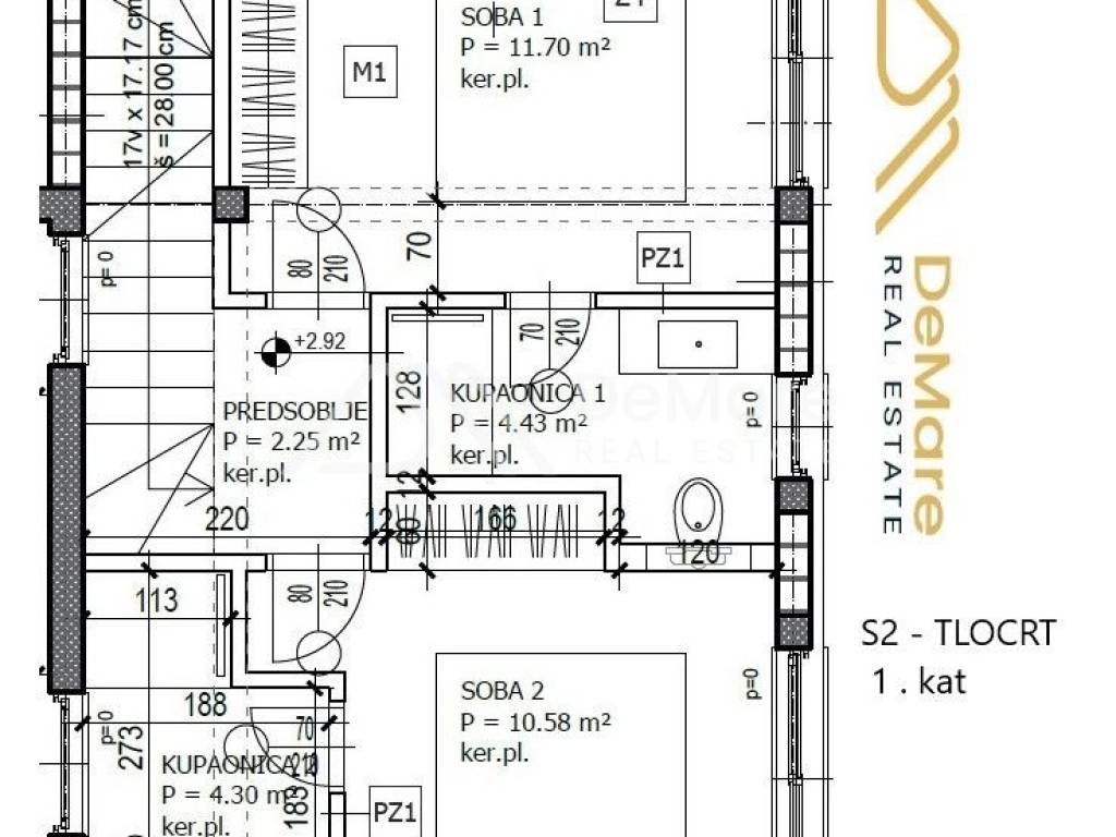 - Two bedrooms (11.70 m2 and 10.58 m2),