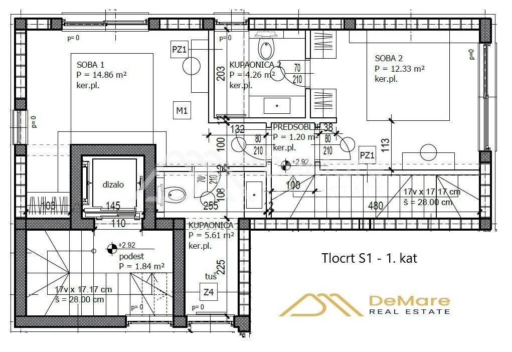 - Two bathrooms (5.61 m2 and 4.26 m2).