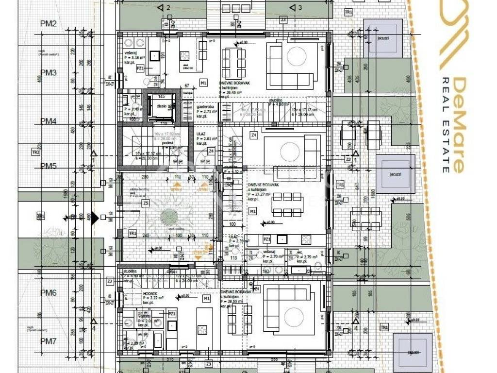 The apartment is practically designed like a house. A beautiful, luxurious, modern apartment in an attractive location, near the sea and the beach; it occupies a third of the floor on the ground floor and on the 1st floor, and also has a part of the garden. The living room is separated from the garden terrace and courtyard by a glass wall, where a massage pool can be installed, and various additional facilities for outdoor living can be arranged.