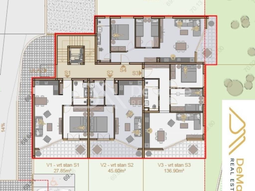 The apartment has a covered terrace (10.30 m2) and a spacious garden (133.40 m2), 2 garage parking spaces (2 x 17 m2) and a storage room (4.32 m2) in the basement of the building, so the total calculated useful value of the apartment with its belongings is 98.27 m2 (gross 242,64 m2).