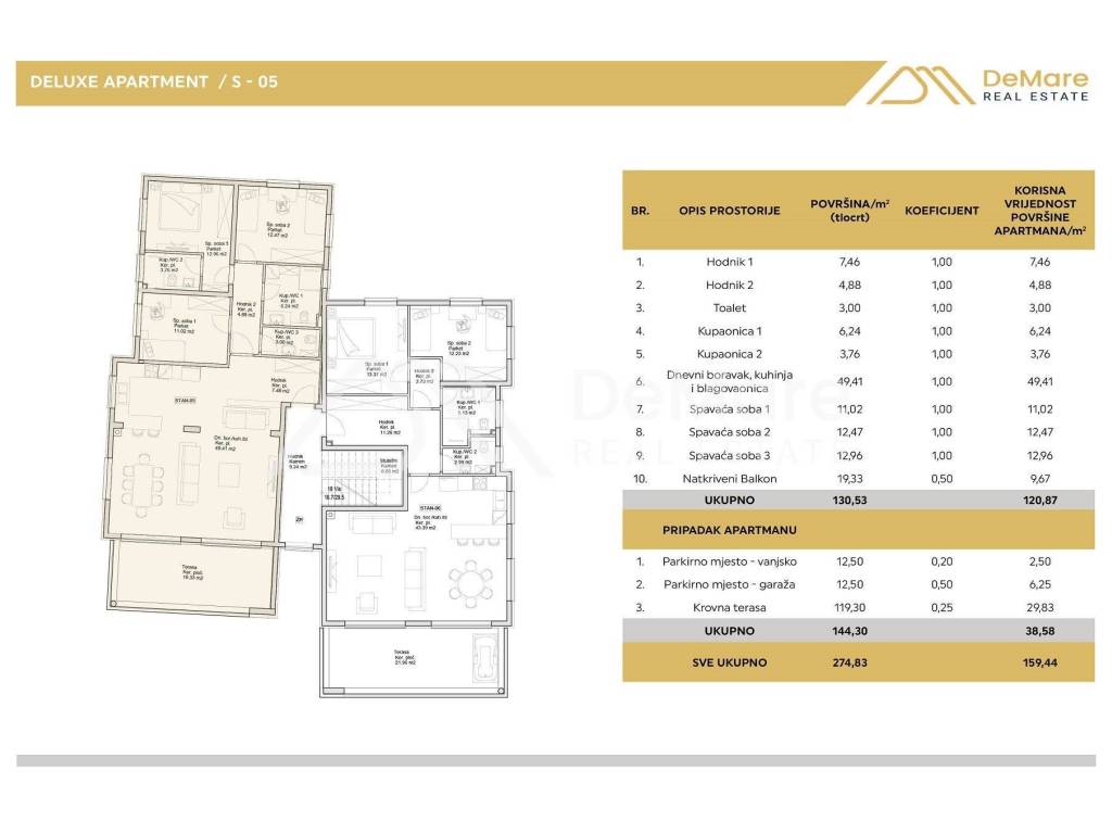 The apartment also includes 2 outdoor (2 x 12.50 m2) and one garage (12.50 m2) parking spaces.