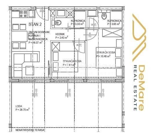 This is a ground floor apartment. The layout of the rooms consists of a hallway, 2 bedrooms, a bathroom, a kitchen with a dining room and a living room, and a covered terrace. The net usable area of the described premises with a terrace is 68.11 m2. In addition, the apartment has two parking spaces and a garden of approx. 24.65 m2.