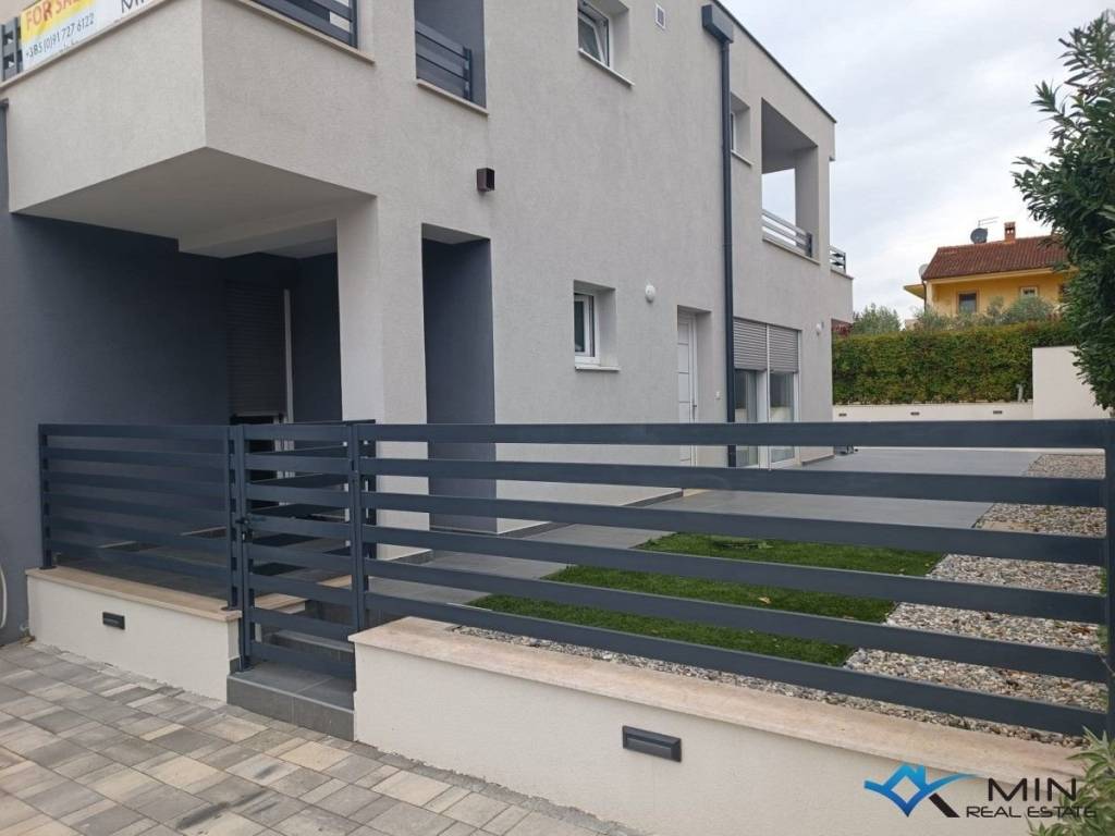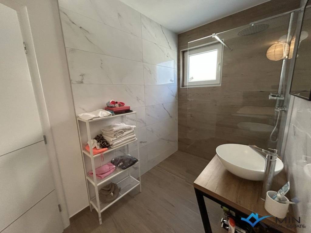 A modern semi-detached house is for sale in a peaceful location in Novigrad. The house is 115 m² and consists of a ground floor and first floor. On the ground floor, there is an entrance hallway, a guest toilet, a storage room, a bedroom with an en-suite bathroom, and an open-plan space that includes a kitchen with a dining area and a living room with access to a covered terrace, swimming pool, and sun deck. Upstairs, there are two bedrooms, each with its own private bathroom, and two covered terraces, one of which offers a sea view. The house also has an additional 20 m² room that can be used as a studio flat (all installations are in place), a garage, or extra storage, depending on the new owner"s wishes. Heating and cooling are provided by air conditioning units. The property includes a garden of 267 m² where several cars can be parked. The house is being sold furnished.