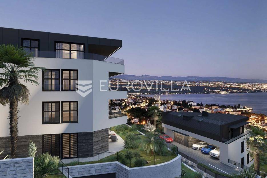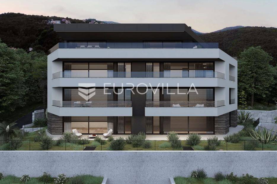 Trosoban stan neto korisne površine 119,69 m2 smješten u prizemlju.Sastoji se od ulaza, hodnika, dnevnog boravka, kuhinje, wc-a, 2 spavaće sobe, 2 kupaonice, natkrivene terase, nenatkrivene terase te vrta.Obvezna je kupnja garaže po cijeni od 4.500 EUR/m2.-----Izuzetna novogradnja u samom centru Opatije s planiranim useljenjem 10/2025.Konstrukcija zgrade sastoji se od armirano-betonskih nosivih zidova i monolitnih međukatnih ploča. Pregradni zidovi izvedeni su u sustavu Knauf W112, s obostranim oblogama od dvije Knauf ploče i ispunom od kamene vune, što poboljšava zvučnu izolaciju.Krov je pokriven Prefa falcanim limenim pokrovom s izolacijom od mineralne vune, parnom branom i prozračivanjem. Krovni prozori Velux opremljeni su električnom roletom, mogućnošću otvaranja i sjenilom.Fasada kombinira DEMIT sustav proizvođača Caparol s efektom samopranja i ventiliranu fasadu obloženu Swisspearl velikoformatnim pločama. Toplinska izolacija izvedena je od mineralne vune i stiropora debljine 12-15 cm.Vanjska stolarija uključuje visokoučinkovitu aluminijsku stolariju Schüco u smeđoj boji, s troslojnim IZO staklom koje povećava energetsku učinkovitost. Podizno-klizne stijene su u ravnini poda, a plastifikacija Tiger drylack otporna je na morske uvjete. Aluminijske žaluzine Hella u boji stolarije električno su pokretane. Stubište je obloženo poliranim svijetlim kamenom ili keramikom i u cijelosti osvijetljeno rasvjetom na senzore. U prizemlju su ugrađeni poštanski sandučići, a u objektu se nalazi dizalo Otis dimenzija 1500x1500 mm, električno, bezreduktorsko, niskošumno, brzine 1,0 m/s, s luksuzno opremljenom kabinom (Modern Ambiance - Advance version). Objekt 1080 uključuje zajedničku teretanu i wellness zonu. Ulazna vrata Inotherm opremljena su otključavanjem putem otiska prsta i ambijentalnim osvjetljenjem, s Schüco profilima i troslojnim staklom.Objekti raspolažu s ukupno 26 parkirnih mjesta, uključujući garažna parkirna mjesta osvijetljena rasvjetom na senzore. Ulazne rampe imaju elektromotor na daljinsko upravljanje, a garažna vrata su niskošumna i također na daljinsko upravljanje. Završna podna obloga u garaži je Sika industrijski pod. Svaki stan ima pripadajuće spremište.Okoliš je uređen zelenim površinama s autohtonim raslinjem, pješačkim i kolnim prilazima od betonskog opločenja i asfalta. Predviđeno je zasebno mjesto za smještaj komunalnog otpada izvan objekta te automatsko navodnjavanje okoliša.Visina nadzemnih etaža iznosi 260 cm, dok unutarnja stolarija ima visinu od 230 cm (zidarski otvor). Unutarnja vrata imaju zvučno izolirano krilo, široke lajsne, skrivene pante i lakirana su bijelim polumat lakom. Protuprovalna i protupožarna ulazna vrata Dierre Sleek imaju skrivene pante, automatsko zatvaranje i vrhunsku oblogu.Sanitarni čvorovi opremljeni su fleksibilnom hidroizolacijom SIKA ili MAPEI na svim podovima i dijelovima zidova. Ugrađene su dizajnerske konzolne sanitarije talijanskog proizvođača Alice, walk-in tuševi u ravnini poda te TECE vodokotlići. Zidovi i podovi obloženi su prvoklasnim keramičkim pločicama većih dimenzija.Zidovi su završno obrađeni bijelom poludisperzivnom bojom, dok su podovi prekriveni visokokvalitetnim višeslojnim hrastovim parketom, lakiranim polumat lakom, postavljenim u CHEVRON uzorak, hrvatskog proizvođača Galeković. Plivajući pod sastoji se od elastificiranog polistirena (1,0 cm), ekspandiranog polistirena (3,0 cm), sloja s podnim grijanjem (2,0 cm), plivajućeg cementnog estriha (4,0 cm) i podne obloge debljine cca 2,0 cm. U sanitarnim čvorovima i kuhinjama postavljene su prvoklasne keramičke pločice Flaviker.Svaki stan ima zasebno brojilo za vodu, a kanalizacijske vertikale izvedene su niskošumnim cijevima Geberit Silent PP.Sustav grijanja i hlađenja uključuje split sustav za hlađenje dnevnog boravka, kuhinje i soba. Podno grijanje i priprema potrošne tople vode izvedeni su pomoću dizalica topline niske razine buke, s vanjskim jedinicama na krovu i unutarnjima u servisnim prostorima. Vodeno podno grijanje pokriva sve prostorije, a instalacije grijanja izvedene su poli etilenskim cijevima visoke gustoće. U kupaonicama su postavljeni električni kupaonski radijatori, a prostorije bez prirodne ventilacije imaju ugrađenu lokalnu odsisnu ventilaciju.Elektroinstalacije uključuju videoportafonski sustav u boji s ekranom osjetljivim na dodir, videonadzor zajedničkih prostora te modularne utičnice i prekidače Vimar Neve Up. U stubištu, na lođama, u kupaonicama i WC-ima ugrađene su stilske plafonjere, dok je sva rasvjeta LED tehnologije. Postavljen je zajednički zemaljski TV program te informatička mreža Cat 6 s razvodnim ormarom u stanu.Smart home instalacija izvedena je s ABB Free@home sustavom, koji funkcionira bez internet konekcije, s kabliranom instalacijom i višestruko nagrađivanom tehnologijom.Ventilacija uključuje prisilnu ventilaciju u sanitarnim čvorovima i ventilacijskim kanalima sa zasebnim vertikalama. Predviđen je odsis otpadnog zraka kuhinjskim napama te pričuvni dimovodni kanal za svaku stambenu jedinicu.Schüco VentoTherm sustav prozračivanja omogućuje decentralizirani prozorski rekuperator energetske klase A+, s visoko učinkovitim povratom topline i smanjenjem buke. Pruža zaštitu od peludi i alergena te omogućava kontroliranu ventilaciju s učinkom povrata topline do 81%. Zahvaljujući integriranoj bypass tehnologiji, funkcija povrata topline može se privremeno isključiti radi hlađenja tijekom ljetnih mjeseci. U usporedbi s ručnom ventilacijom, ovaj sustav sprječava propuh, zadržava zvučnu izolaciju i toplinsku zaštitu, čime nudi značajne prednosti u odnosu na klasično prozračivanje.