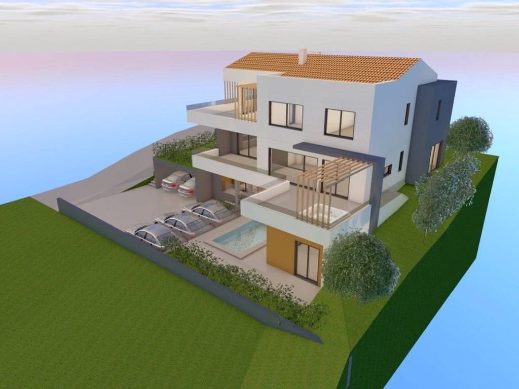 We offer an attractive building plot with a total area of 1,134 m² (two plots of 575 m² and 559 m²), located in a luxury modern villa complex in Krnica, one of the most desirable parts of southern Istria. The location offers complete peace and privacy, with close proximity to the sea and the recognizable Istrian nature. A preliminary design has been prepared for the land for the construction of a luxury residential villa with a swimming pool, with a total gross area of 553.72 m², distributed over three floors: basement, ground floor and first floor. The project envisages three residential units, a 16.5 m² swimming pool, jacuzzi, five parking spaces, and a spacious terrace with open views of the surrounding landscape. The architectural solution is characterized by a combination of modern aesthetics and Mediterranean spirit, large glass surfaces, straight lines and a harmonious relationship between the interior and exterior create a feeling of luxury and openness to nature. The surroundings of newly built high-class villas, low building density and peaceful location make this land extremely valuable and rare on the market. Both plots are included in the price, which allows the buyer flexibility, from the realization of an existing project to the creation of their own concept of a luxury complex. This property represents an ideal opportunity for investors and individuals looking for exclusive land with a finished project in one of the most beautiful parts of Istria.