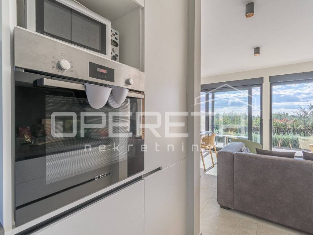 Just a few minutes" drive from Sv. Lovreč, this newly built, fully furnished, and modernly equipped house is situated, offering a perfect blend of Mediterranean charm, comfort, and privacy. The house has a living area of 102 m² on a plot of 567 m². It also includes a 27 m² swimming pool with a spacious sun deck of 48 m². The interior offers three bedrooms, two bathrooms, plus an additional toilet and laundry room. The house has an energy rating A. It is completely furnished with high-end modern furniture and appliances and carefully designed so that every corner provides a sense of home and relaxation. The spacious covered terrace features a summer kitchen with a grill, refrigerator, sink, and practical work surfaces, as well as a large dining table. The terrace offers a view of an olive grove with no possibility of further construction, which guarantees lasting peace and privacy. Next to the pool, there are six sun loungers and a shower. The surroundings are carefully landscaped with Mediterranean plants such as lavender, palms, and laurel cherry, all watered by an automatic system.