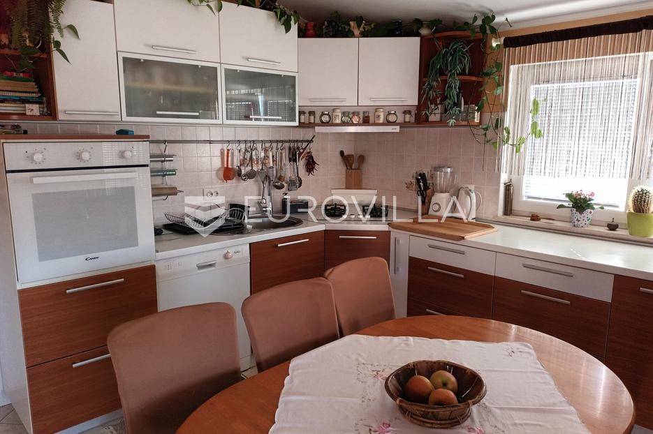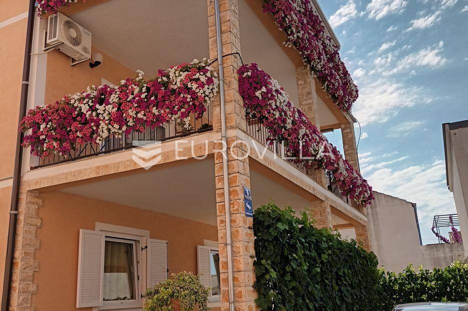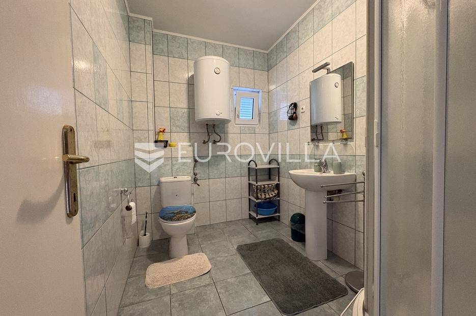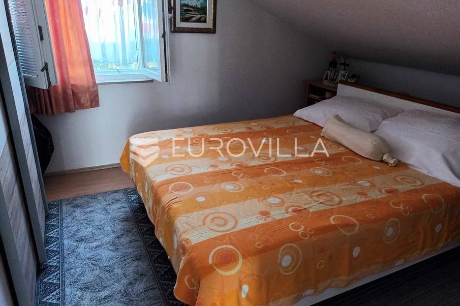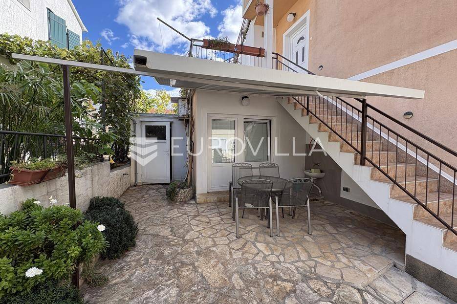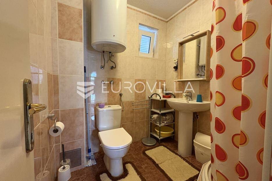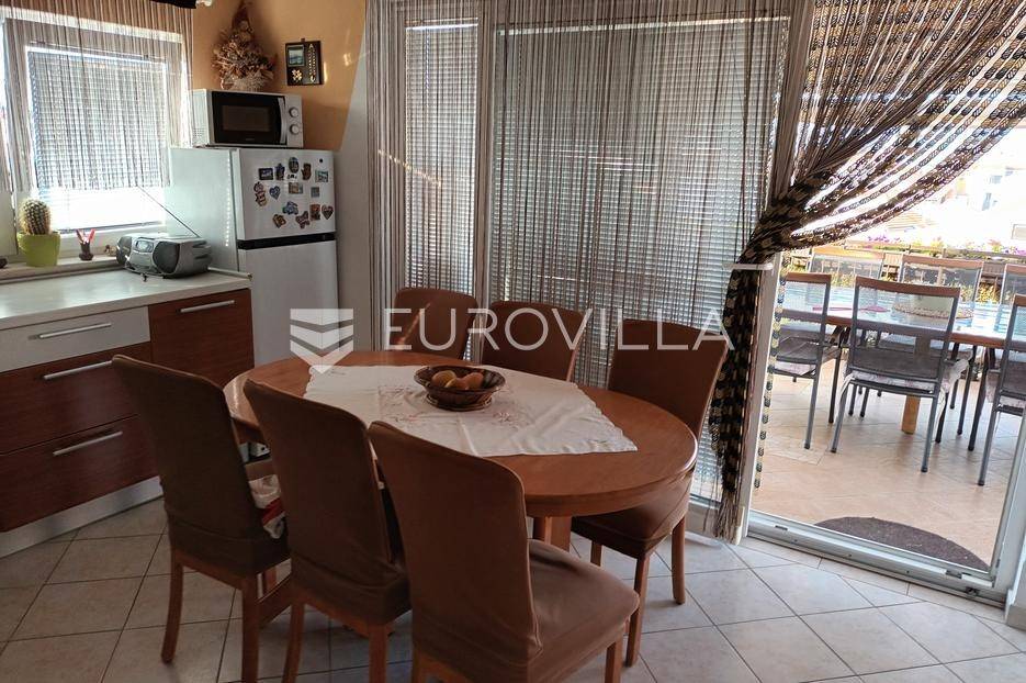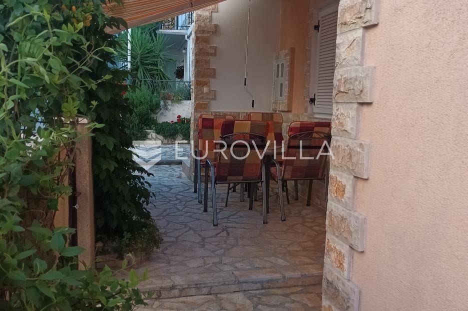 Kuća je nadograđena i renovirana 2007. godine.Sastoji se od prizemlja u kojem se nalaze dva apartmana, svaki s jednom spavaćom sobom, dnevnim boravkom s kuhinjom i blagovaonicom, te kupaonicom. Apartmani imaju zasebne ulaze. Vanjskim stepenicama dolazi se na prvi kat gdje su još dva apartmana iste površine i rasporeda kao i apartmani u prizemlju, te uz to svaki apartman ima svoju terasu. Na drugom katu nalazi se veliki stan s dvije spavaće sobe, prostranim dnevnim boravkom, kuhinjom s blagovaonicom, te velikom terasom s pogledom na more.Kuća se prodaje potpuno opremljena i spremna za useljenje, ili nastavak uspješne djelatnosti iznajmljivanja. Kuća je dobro opremljena, svi apartmani su klimatizirani, te su na krovu postavljeni solarni paneli za proizvodnju električne energije.Sve ostale informacije na upit.