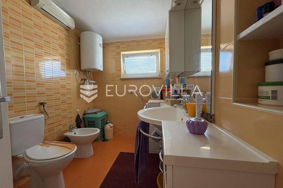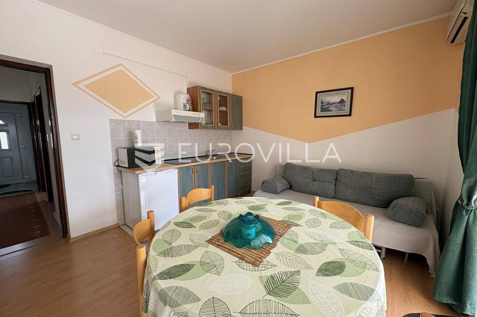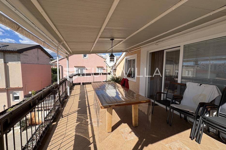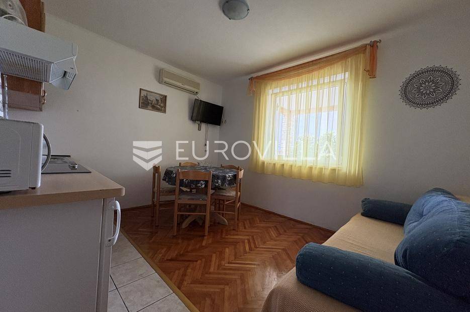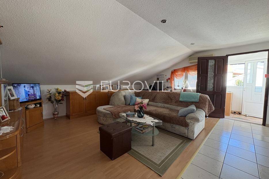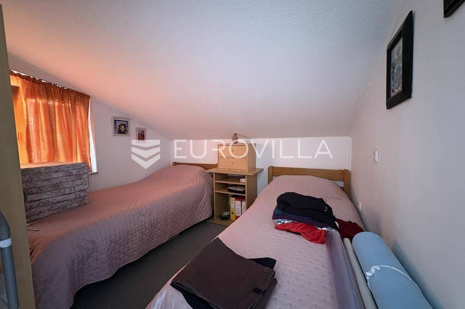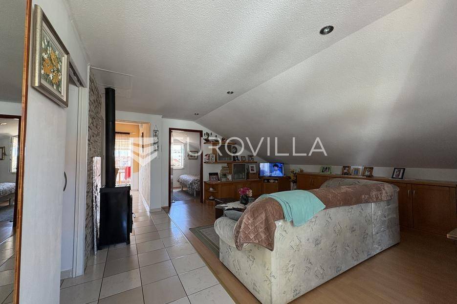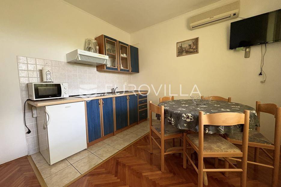 Kuća je nadograđena i renovirana 2007. godine.Sastoji se od prizemlja u kojem se nalaze dva apartmana, svaki s jednom spavaćom sobom, dnevnim boravkom s kuhinjom i blagovaonicom, te kupaonicom. Apartmani imaju zasebne ulaze. Vanjskim stepenicama dolazi se na prvi kat gdje su još dva apartmana iste površine i rasporeda kao i apartmani u prizemlju, te uz to svaki apartman ima svoju terasu. Na drugom katu nalazi se veliki stan s dvije spavaće sobe, prostranim dnevnim boravkom, kuhinjom s blagovaonicom, te velikom terasom s pogledom na more.Kuća se prodaje potpuno opremljena i spremna za useljenje, ili nastavak uspješne djelatnosti iznajmljivanja. Kuća je dobro opremljena, svi apartmani su klimatizirani, te su na krovu postavljeni solarni paneli za proizvodnju električne energije.Sve ostale informacije na upit.