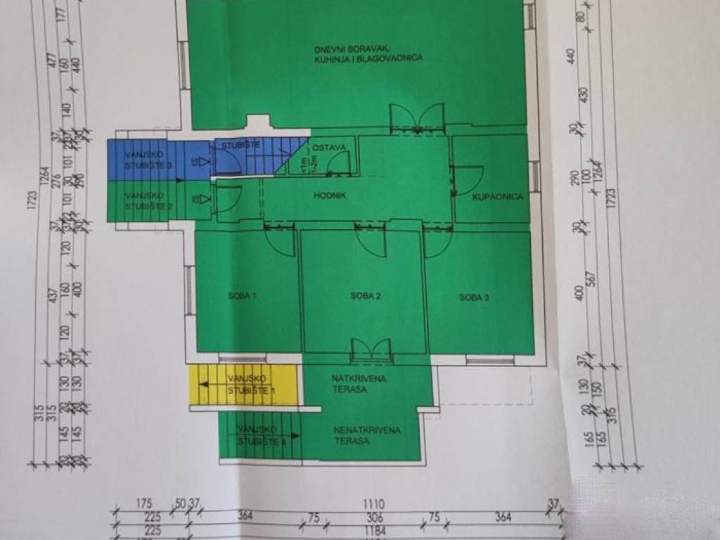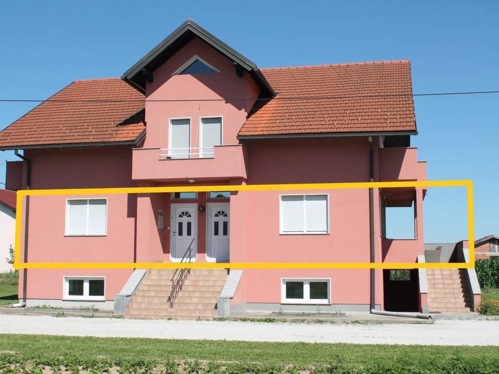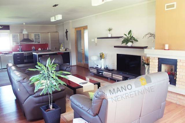 Stan se sastoji od Dnevnog Boravka s kuhinjom i blagavaonom, 3 sobe,kupaone,ostave,hodnika,stubišta i terase.