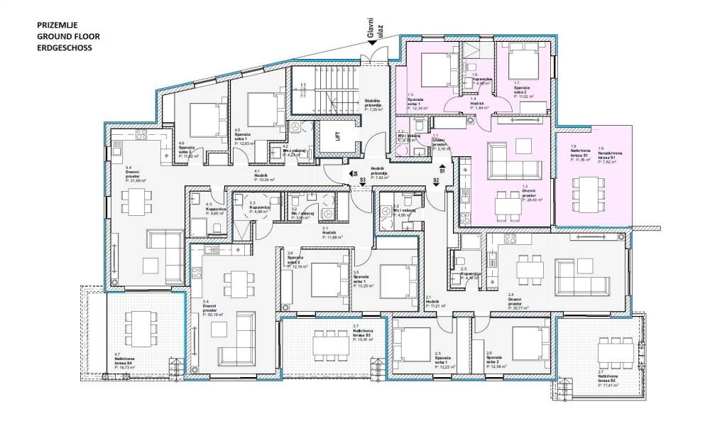 S1 apartment on the ground floor with a total area of 74.78 m² consists of an entrance, WC/laundry room, hallway, bathroom, two bedrooms, kitchen with dining area, living room, and a partially covered terrace of 19.71 m². The apartment includes the corresponding part of the garden, storage in the basement, and one parking space. PRICE: €284,164.00 (VAT included in the apartment price).
