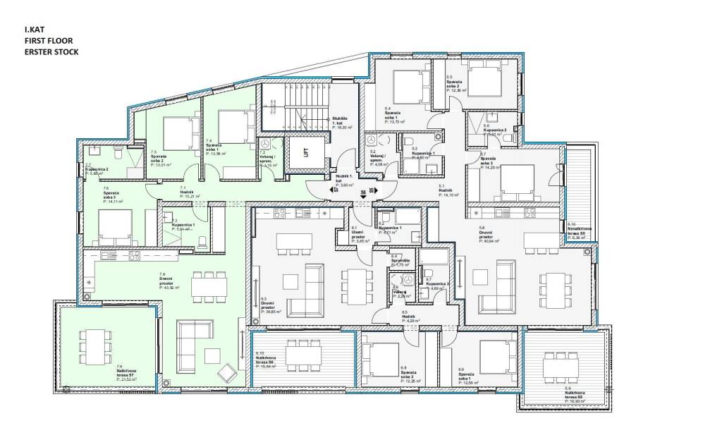 Apartment S7 on the first floor with a total area of 125.48 m2 consists of entrance, hallway, laundry room, bathroom 1, two bedrooms, a bedroom with en-suite bathroom 2, kitchen with dining area, and living room, covered terrace of 21.52 m2. The apartment includes a storage room in the basement and one parking space. PRICE: €527,016.00 (VAT included in the apartment price).