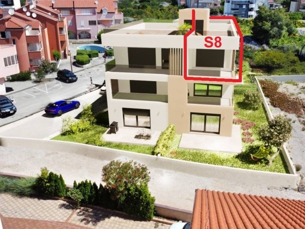 Apartment TS-S8 consists of 3 bedrooms, hallway and entrance hall, kitchen-dining room-living room, 3 bathrooms, one covered terrace. The apartment has a 2 parking space. This apartment also has a terrace of 56.84 m2, located on the third floor of the building.