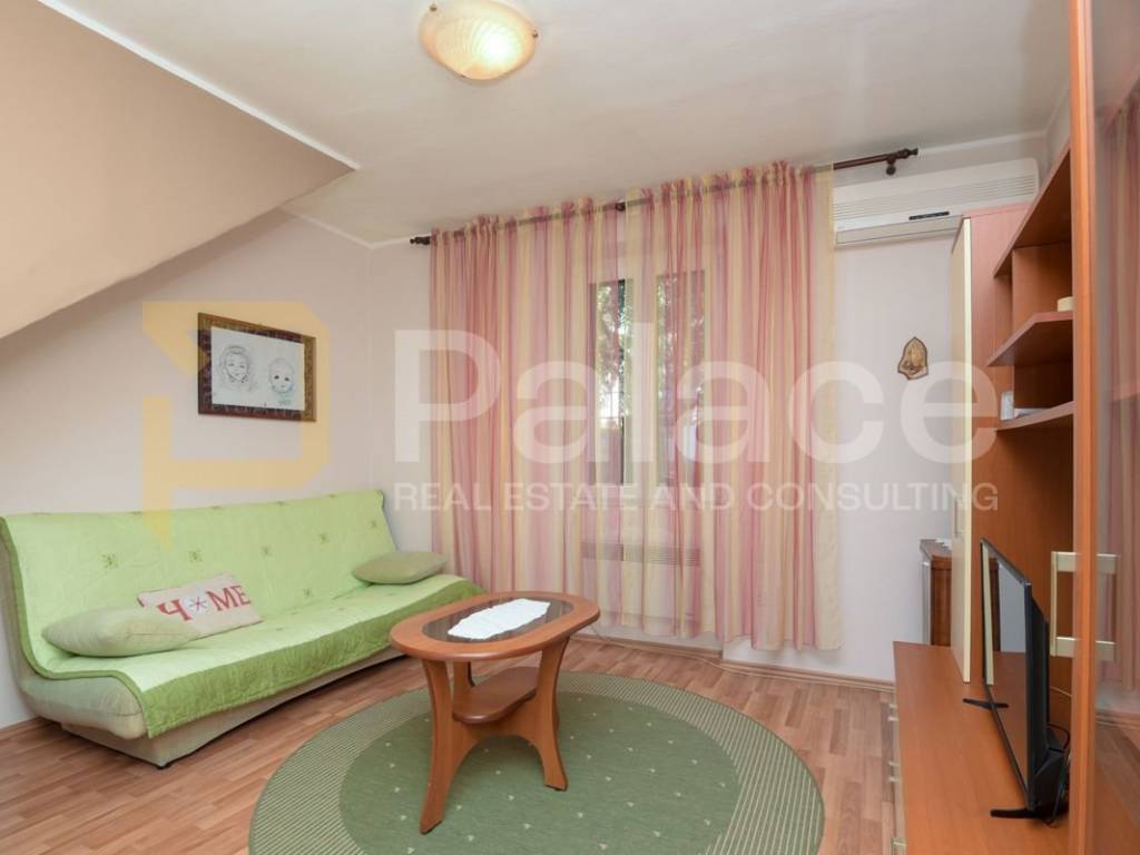The house consists of two floors, the first and second floor, with a total net area of 63 m2, with each floor measuring around 30 m2. External stairs lead to the main entrance and the veranda that leads into the apartment. On the first floor, there is a kitchen with a dining area and a cozy living room, as well as a bathroom.