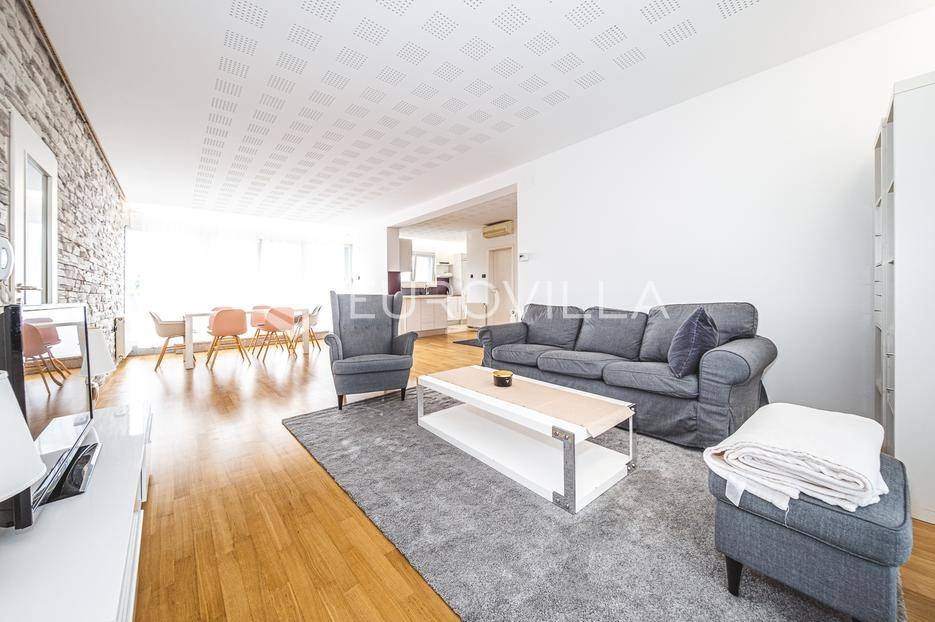 Lašćinska cesta, kompletno namješten četverosoban stan na prvom katu manje stambene zgrade od ukupno 3 stana, izgrađene 2017. godine. Ukupne zatvorene površine 120 m2, PRVI NAJAM.Sastoji se od ulaznog prostora, kuhinje, prostranog dnevnog boravka i blagovaonice s izlazom na veliku polunatkrivenu terasu 40 m2, tri prostrane spavaće sobe od kojih dvije imaju direktan izlaz na drugu natkrivenu terasu površine 20 m2, dvije kupaonice i zasebnog vešeraja.Stan je namješten i opremljen kvalitetnim namještajem.Stanu pripada jedno vanjsko parkirno mjesto u dvorištu zgrade.