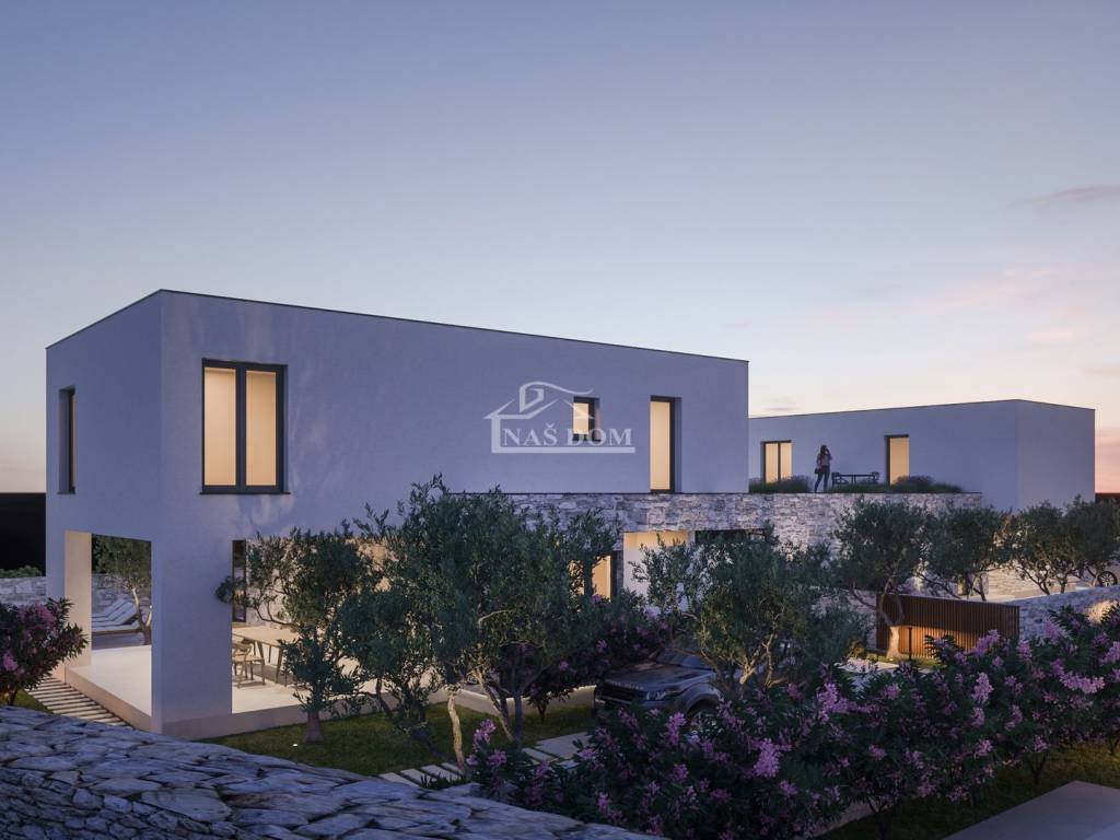 Zaton-**NEW CONSTRUCTION** a complex of modern villas with pools is for sale in a quiet location. The complex consists of 4 urban villas with their own photovoltaic power plant. In this project, great attention is paid to the aesthetics of the villas themselves and their visual harmony with the surroundings, providing a high level of privacy to future owners. It is located on a gentle elevation near all the amenities essential for a pleasant stay and/or living.